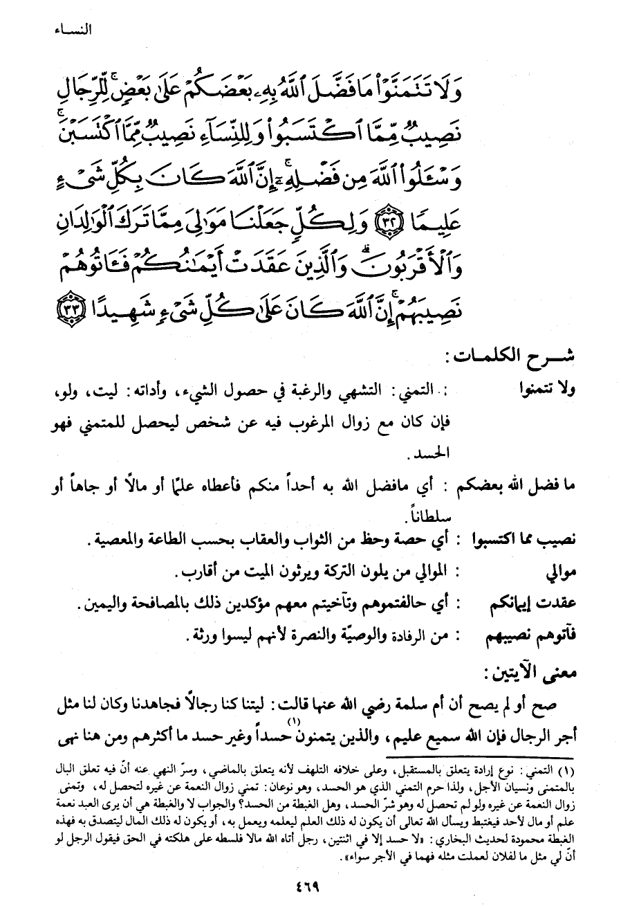 {وَلا تَتَمَنَّوْا مَا فَضَّلَ اللهُ بِهِ بَعْضَكُمْ عَلَى بَعْضٍ لِلرِّجَالِ نَصِيبٌ مِمَّا اكْتَسَبُوا وَلِلنِّسَاءِ نَصِيبٌ مِمَّا اكْتَسَبْنَ وَاسْأَلُوا اللهَ مِنْ فَضْلِهِ إِنَّ اللهَ كَانَ بِكُلِّ شَيْءٍ عَلِيماً (32) وَلِكُلٍّ جَعَلْنَا مَوَالِيَ مِمَّا تَرَكَ الْوَالِدَانِ وَالأَقْرَبُونَ وَالَّذِينَ عَقَدَتْ أَيْمَانُكُمْ فَآتُوهُمْ نَصِيبَهُمْ إِنَّ اللهَ كَانَ عَلَى كُلِّ شَيْءٍ شَهِيداً (33) }