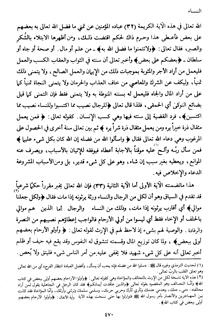 الله تعالى في هذه الآية الكريمة (32) عباده المؤمنين عن تمني ما فضل الله تعالى به بعضهم على بعض فأعطى هذا وحرم ذاك لحكم اقتضت ذلك، ومن أظهرها الابتلاء بالشكر والصبر، فقال تعالى: {وَلا تَتَمَنَّوْا مَا فَضَّلَ اللهُ بِهِ} –من علم أو مال. أو صحة أو جاه أو سلطان- {بَعْضَكُمْ عَلَى بَعْضٍ} وأخبر تعالى أن سنته في الثواب والعقاب الكسب والعمل، فليعمل من أراد الأجر والمثوبة بموجبات ذلك من الإيمان والعمل الصالح، ولا يتمنى ذلك تمنياً، وليكف عن الشرك والمعاصي من خاف العذاب والحرمان ولا يتمنى النجاة تمنياً كما على من أراد المال والجاه فليعمل له بسنته المنوطة به، ولا يتمنى فقط فإن التمني كما قيل بضائع النوكى، أي: الحمقى، فلذا قال تعالى: {لِلرِّجَالِ نَصِيبٌ مِمَّا اكْتَسَبُوا وَلِلنِّسَاءِ نَصِيبٌ مِمَّا اكْتَسَبْنَ} ، فرد القضية إلى سنته فيها وهي كسب الإنسان. كقوله تعالى: {فَمَنْ يَعْمَلْ مِثْقَالَ ذَرَّةٍ خَيْراً يَرَهُ وَمَنْ يَعْمَلْ مِثْقَالَ ذَرَّةٍ شَرّاً يَرَهُ} ثم بين تعالى سنة أخرى في الحصول على المرغوب: وهي دعاء الله تعالى فقال: {وَاسْأَلُوا اللهَ مِنْ فَضْلِهِ إِنَّ اللهَ كَانَ بِكُلِّ شَيْءٍ عَلِيماً} فمن سأل ربه وألح1 عليه موقناً بالإجابة أعطاه فيوفقه للإتيان بالأسباب، ويصرف عنه الموانع، ويعطيه بغير سب إن شاء، وهو على كل شيء قدير، بل ومن الأسباب المشروعة الدعاء والإخلاص فيه.