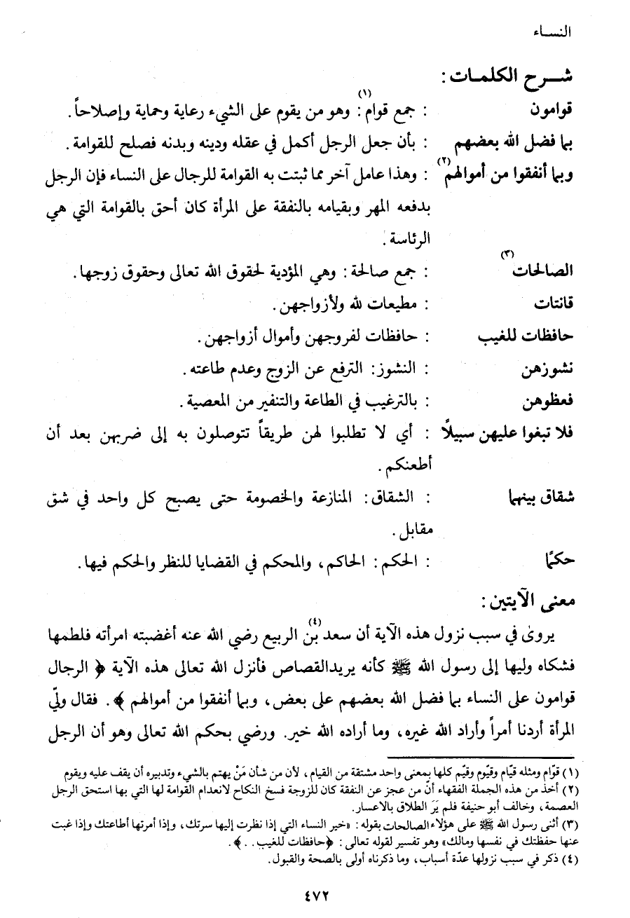 يروى في سبب نزول هذه الآية أن: سعد4 بن الربيع رضي الله عنه أغضبته امرأته فلطمها، فشكاه وليها إلى رسول الله صَلَّى اللهُ عَلَيْهِ وَسَلَّمَ، كأنه يريد القصاص فأنزل الله تعالى هذه الآية: {الرِّجَالُ قَوَّامُونَ عَلَى النِّسَاءِ بِمَا فَضَّلَ اللهُ بَعْضَهُمْ عَلَى بَعْضٍ وَبِمَا أَنْفَقُوا مِنْ أَمْوَالِهِمْ} . فقال ولي المرأة: أردنا أمراً وأراد الله غيره، وما أراده الله خير. ورضي بحكم الله تعالى وهو أن الرجل