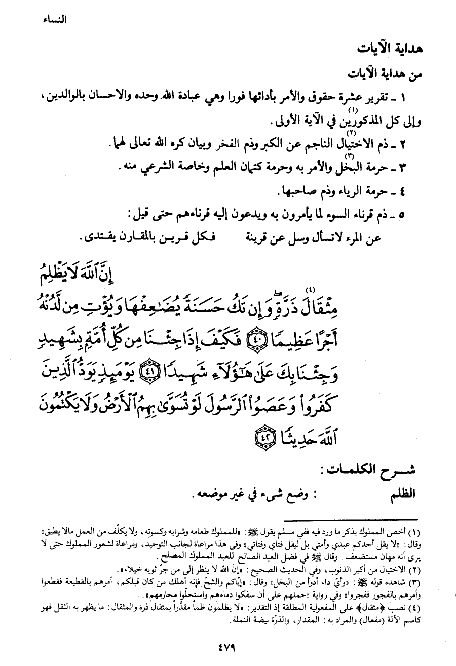 {إِنَّ اللهَ لا يَظْلِمُ مِثْقَالَ4 ذَرَّةٍ وَإِنْ تَكُ حَسَنَةً يُضَاعِفْهَا وَيُؤْتِ مِنْ لَدُنْهُ أَجْراً عَظِيماً (40) فَكَيْفَ إِذَا جِئْنَا مِنْ كُلِّ أُمَّةٍ بِشَهِيدٍ وَجِئْنَا بِكَ عَلَى هَؤُلاءِ شَهِيداً (41) يَوْمَئِذٍ يَوَدُّ الَّذِينَ كَفَرُوا وَعَصَوُا الرَّسُولَ لَوْ تُسَوَّى بِهِمُ الأَرْضُ وَلا يَكْتُمُونَ اللهَ حَدِيثا (42) }