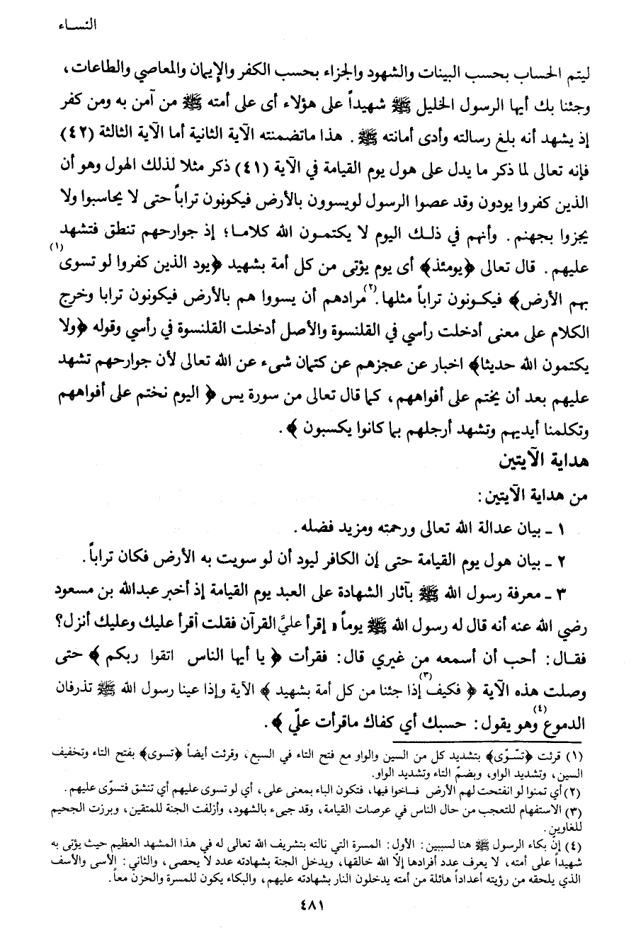 4 إن بكاء الرسول صَلَّى اللهُ عَلَيْهِ وَسَلَّمَ هنا لسببين: الأول: المسرة التي نالته بتشريف الله تعالى له في هذا المشهد العظيم، حيث يؤتى به شهيداً على أمته، لا يعرف عدد أفرادها إلا الله خالقها، ويدخل الجنة بشهادته عدد لا يحصى. والثاني: الأسى والأسف الذي يلحقه من رؤيته أعداداً هائلة من أمته يدخلون النار بشهادته عليهم. واليكاء: يكون للمسرة والحزن معاً.