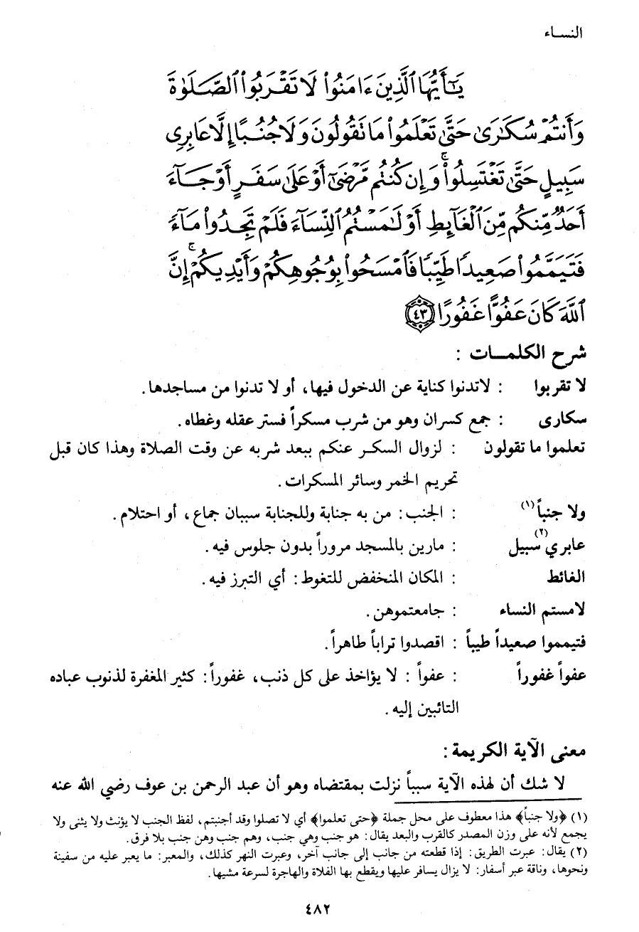 {يَا أَيُّهَا الَّذِينَ آمَنُوا لا تَقْرَبُوا الصَّلاةَ وَأَنْتُمْ سُكَارَى حَتَّى تَعْلَمُوا مَا تَقُولُونَ وَلا جُنُباً إِلا عَابِرِي سَبِيلٍ حَتَّى تَغْتَسِلُوا وَإِنْ كُنْتُمْ مَرْضَى أَوْ عَلَى سَفَرٍ أَوْ جَاءَ أَحَدٌ مِنْكُمْ مِنَ الْغَائِطِ أَوْ لامَسْتُمُ النِّسَاءَ فَلَمْ تَجِدُوا مَاءً فَتَيَمَّمُوا صَعِيداً طَيِّباً فَامْسَحُوا بِوُجُوهِكُمْ وَأَيْدِيكُمْ إِنَّ اللهَ كَانَ عَفُوّاً غَفُوراً (43) }