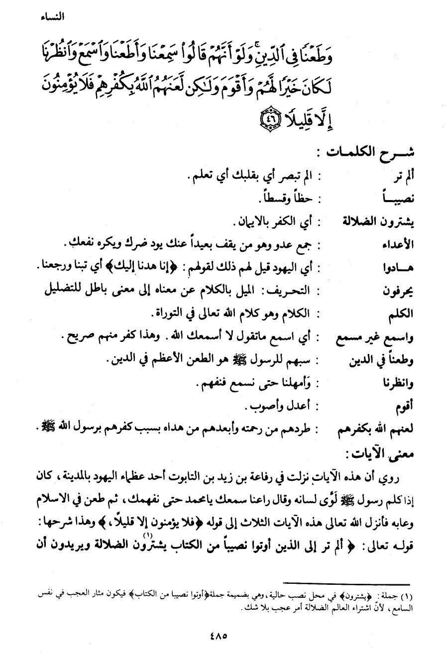 وَطَعْناً فِي الدِّينِ وَلَوْ أَنَّهُمْ قَالُوا سَمِعْنَا وَأَطَعْنَا وَاسْمَعْ وَانْظُرْنَا لَكَانَ خَيْراً لَهُمْ وَأَقْوَمَ وَلَكِنْ لَعَنَهُمُ اللهُ بِكُفْرِهِمْ فَلا يُؤْمِنُونَ إِلا قَلِيلاً (46) }