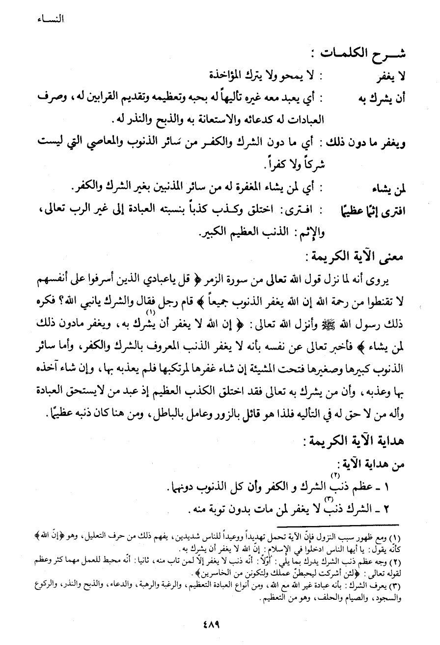 1 ومع ظهور سبب النزول فإن الآية تحمل تهديداً ووعيداً للناس شديدين يفهم ذلك من حرف التعليل، وهو: {إن الله} كأنه يقول: يا أيها الناس ادخلوا في الإسلام إن الله لا يغفر أن يشرك به.