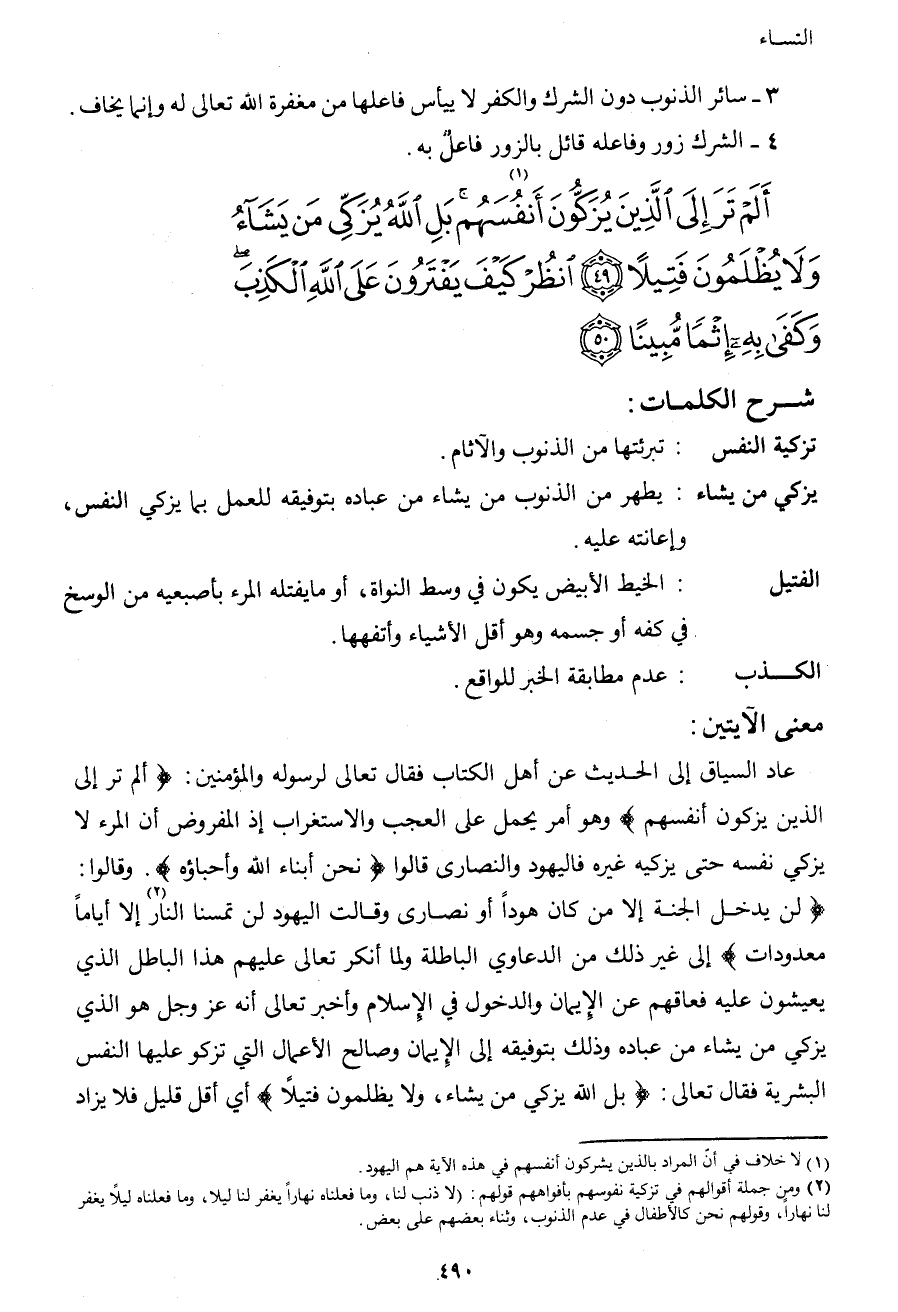 {أَلَمْ تَرَ إِلَى الَّذِينَ يُزَكُّونَ أَنْفُسَهُمْ1 بَلِ اللهُ يُزَكِّي مَنْ يَشَاءُ وَلا يُظْلَمُونَ فَتِيلاً (49) انْظُرْ كَيْفَ يَفْتَرُونَ عَلَى اللهِ الْكَذِبَ وَكَفَى بِهِ إِثْماً مُبِيناً (50) }
