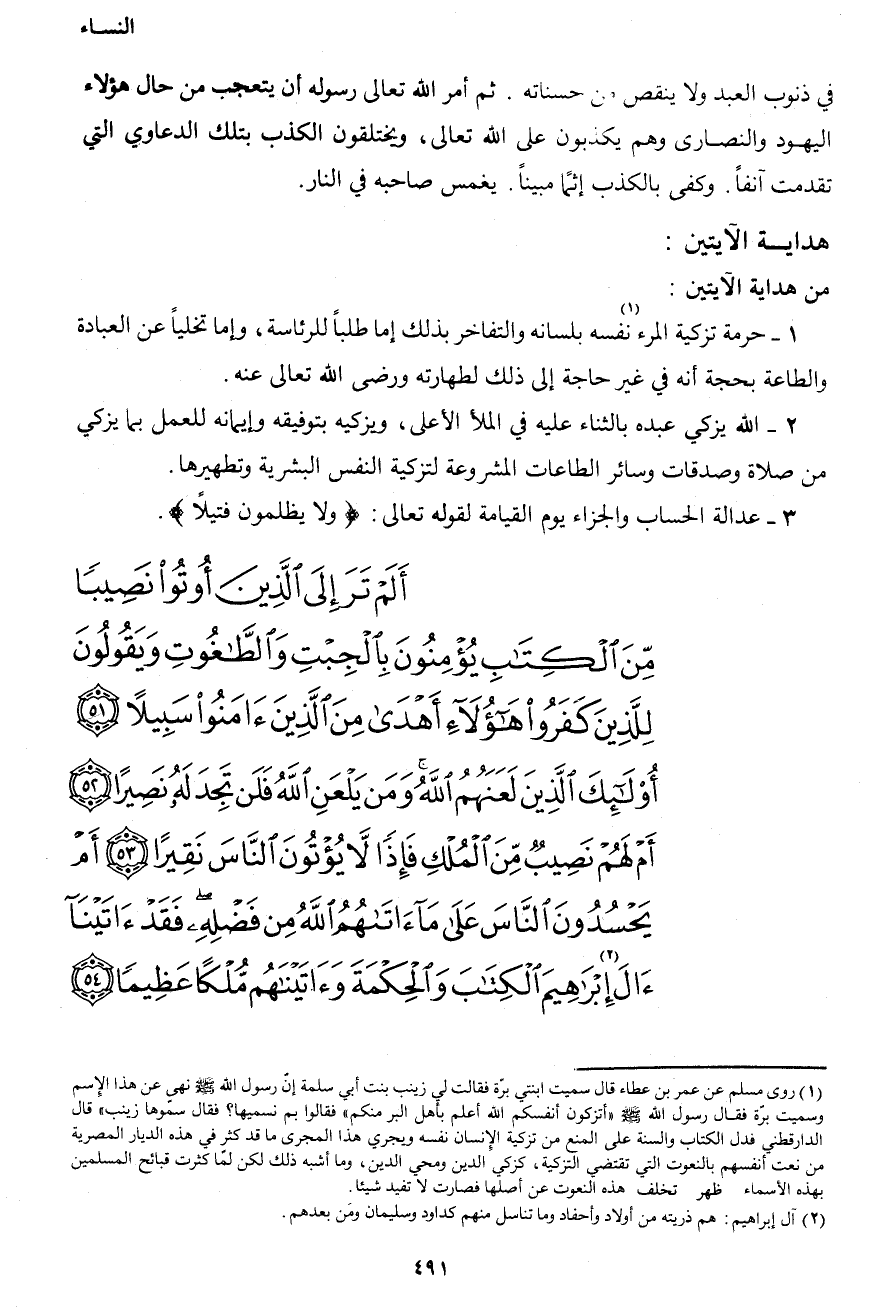 {أَلَمْ تَرَ إِلَى الَّذِينَ أُوتُوا نَصِيباً مِنَ الْكِتَابِ يُؤْمِنُونَ بِالْجِبْتِ وَالطَّاغُوتِ وَيَقُولُونَ لِلَّذِينَ كَفَرُوا هَؤُلاءِ أَهْدَى مِنَ الَّذِينَ آمَنُوا سَبِيلاً (51) أُولَئِكَ الَّذِينَ لَعَنَهُمُ اللهُ وَمَنْ يَلْعَنِ اللهُ فَلَنْ تَجِدَ لَهُ نَصِيراً (52) أَمْ لَهُمْ نَصِيبٌ مِنَ الْمُلْكِ فَإِذاً لا يُؤْتُونَ النَّاسَ نَقِيراً (53) أَمْ يَحْسُدُونَ النَّاسَ عَلَى مَا آتَاهُمُ اللهُ مِنْ فَضْلِهِ فَقَدْ آتَيْنَا آلَ2 إِبْرَاهِيمَ الْكِتَابَ وَالْحِكْمَةَ وَآتَيْنَاهُمْ مُلْكاً عَظِيماً (54)