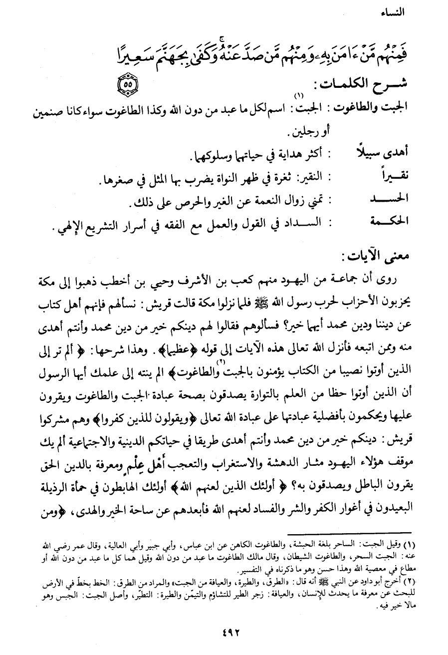 روي أن جماعة من اليهود منهم كعب بن الأشرف وحيي بن أخطب ذهبوا إلى مكة يحزبون الأحزاب لحرب رسول الله صَلَّى اللهُ عَلَيْهِ وَسَلَّمَ، فلما نزلوا مكة قالت قريش: نسألهم فإنهم أهل كتاب عن ديننا ودين محمد أيهما خير؟ فسألوهم فقالوا لهم دينكم خير من دين محمد وأنتم أهدى منه وممن اتبعه. فأنزل الله تعالى هذه الآيات إلى قوله {عَظِيماً} . وهذا شرحها: {أَلَمْ تَرَ إِلَى الَّذِينَ أُوتُوا نَصِيباً مِنَ الْكِتَابِ يُؤْمِنُونَ بِالْجِبْتِ2 وَالطَّاغُوتِ} ألم ينته إلى علمك أيها الرسول: أن الذين أوتوا حظاً من العلم بالتوراة يصدقون بصحة عبادة الجبت والطاغوت ويقرون عليها ويحكمون بأفضلية عبادتها على عبادة الله تعالى {وَيَقُولُونَ لِلَّذِينَ كَفَرُوا} وهم مشركوا قريش: دينكم خير من دين محمد وأنتم أهدى طريقاً في حياتكم الدينية والاجتماعية ألم يك موقف هؤلاء اليهود مثار الدهشة والاستغراب والتعجب لأهل العلم والمعرفة بالدين الحق، إذ يقرون الباطل ويصدقون به؟ {أُولَئِكَ الَّذِينَ لَعَنَهُمُ اللهُ} أولئك الهابطون في حمأة الرذيلة، البعيدون في أغوار الكفر والشر والفساد لعنهم الله فأبعدهم عن ساحة الخير والهدى، {وَمَنْ