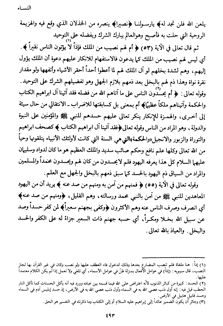 وقوله تعالى: {أَمْ يَحْسُدُونَ2 النَّاسَ عَلَى مَا آتَاهُمُ اللهُ مِنْ فَضْلِهِ فَقَدْ آتَيْنَا آلَ إِبْرَاهِيمَ الْكِتَابَ وَالْحِكْمَةَ وَآتَيْنَاهُمْ مُلْكاً عَظِيماً} أم بمعنى بل كسابقتها للإضراب –الانتقال من حال سيئة إلى أخرى، والهمزة للإنكار ينكر تعالى عليهم حسدهم للنبي صَلَّى اللهُ عَلَيْهِ وَسَلَّمَ والمؤمنين على النبوة والدولة، وهو المراد من الناس وقوله تعالى: {فَقَدْ آتَيْنَا آلَ إِبْرَاهِيمَ الْكِتَابَ} ؛ كصحف إبراهيم والتوراة والزبور والإنجيل، والحكمة التي هي السنة التي كانت لأولئك الأنبياء يتلقونها وحياً من الله تعالى، وكلها علم نافع وحكم صائب سديد، والملك العظيم هو ما كان لداود وسليمان عليهما السلام كل هذا يعرفه اليهود فلم لا يحسدون محمداً والمسلمين، والمراد من السياق ذم اليهود بالحسد كما سبق ذمهم بالبخل والجهل مع العلم.