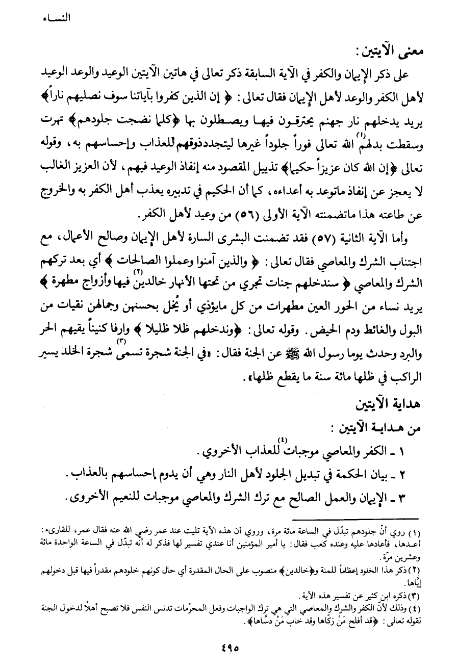 على ذكر الإيمان والكفر في الآية السابقة ذكر تعالى في هاتين الآيتين الوعيد والوعد الوعيد لأهل الكفر والوعد لهل الإيمان فقال تعالى: {إِنَّ الَّذِينَ كَفَرُوا بِآيَاتِنَا سَوْفَ نُصْلِيهِمْ نَاراً} يريد يدخلهم نار جهنم يحترقون فيها ويصطلون بها {كُلَّمَا نَضِجَتْ جُلُودُهُمْ} تهرت وسقطت بدلهم1 الله تعالى فوراً جلوداً غيرها ليتجدد ذوقهم للعذاب وإحساسهم به، وقوله تعالى: {إِنَّ اللهَ كَانَ عَزِيزاً حَكِيماً} تذييل المقصود منه إنفاذ الوعيد فيهم؛ لأن العزيز الغالب لا يعجز عن إنفاذ ما توعد به أعداءه، كما أن الحكيم في تدبيره يعذب أهل الكفر به والخروج عن طاعته، هذا ما تضمنته الآية الأولى (56) من وعيد لأهل الكفر.