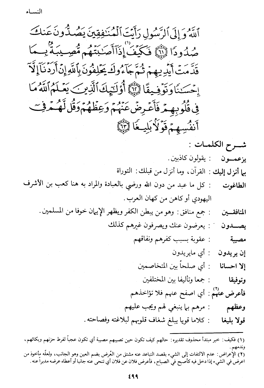 اللهُ وَإِلَى الرَّسُولِ رَأَيْتَ الْمُنَافِقِينَ يَصُدُّونَ عَنْكَ صُدُوداً (61) فَكَيْفَ1 إِذَا أَصَابَتْهُمْ مُصِيبَةٌ بِمَا قَدَّمَتْ أَيْدِيهِمْ ثُمَّ جَاءُوكَ يَحْلِفُونَ بِاللهِ إِنْ أَرَدْنَا إِلا إِحْسَاناً وَتَوْفِيقاً (62) أُولَئِكَ الَّذِينَ يَعْلَمُ اللهُ مَا فِي قُلُوبِهِمْ فَأَعْرِضْ عَنْهُمْ وَعِظْهُمْ وَقُلْ لَهُمْ فِي أَنْفُسِهِمْ قَوْلاً بَلِيغاً (63) }