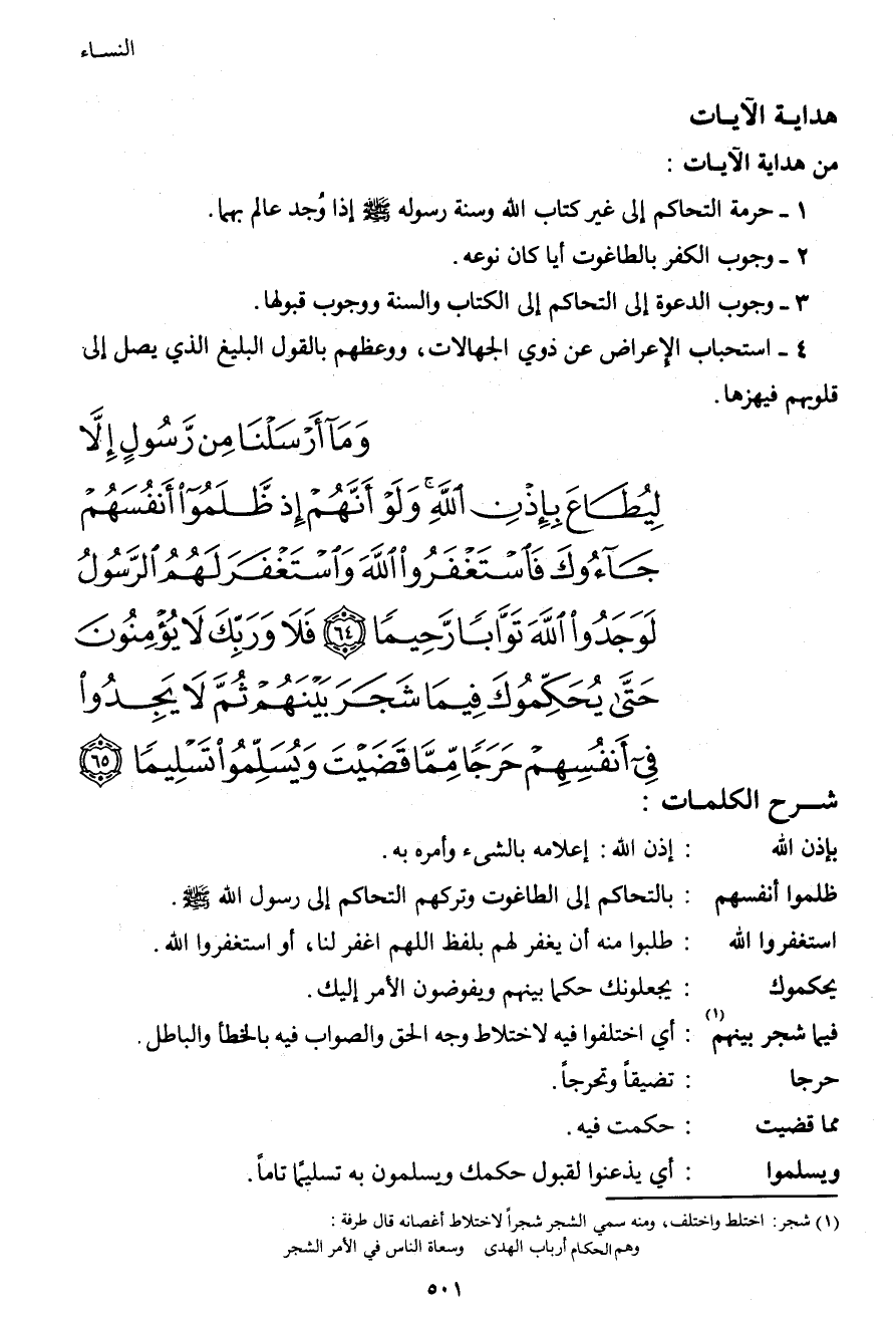 {وَمَا أَرْسَلْنَا مِنْ رَسُولٍ إِلا لِيُطَاعَ بِإِذْنِ اللهِ وَلَوْ أَنَّهُمْ إِذْ ظَلَمُوا أَنْفُسَهُمْ جَاءُوكَ فَاسْتَغْفَرُوا اللهَ وَاسْتَغْفَرَ لَهُمُ الرَّسُولُ لَوَجَدُوا اللهَ تَوَّاباً رَحِيماً (64) فَلا وَرَبِّكَ لا يُؤْمِنُونَ حَتَّى يُحَكِّمُوكَ فِيمَا شَجَرَ بَيْنَهُمْ ثُمَّ لا يَجِدُوا فِي أَنْفُسِهِمْ حَرَجاً مِمَّا قَضَيْتَ وَيُسَلِّمُوا تَسْلِيما (65) }