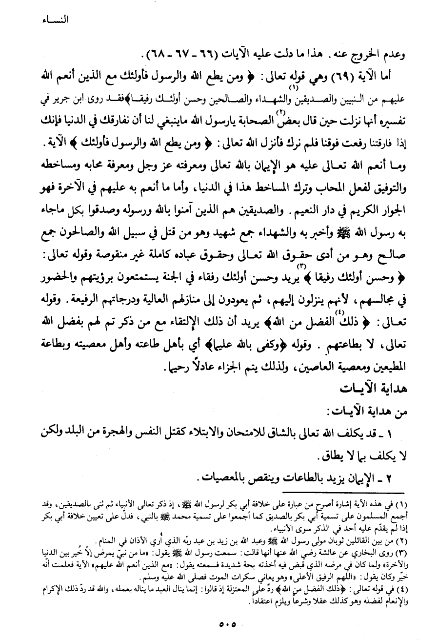 أما الآية (69) وهي قوله تعالى: {وَمَنْ يُطِعِ اللهَ وَالرَّسُولَ فَأُولَئِكَ مَعَ الَّذِينَ أَنْعَمَ اللهُ عَلَيْهِمْ مِنَ النَّبِيِّينَ وَالصِّدِّيقِينَ1 وَالشُّهَدَاءِ وَالصَّالِحِينَ وَحَسُنَ أُولَئِكَ رَفِيقاً} فقد روى ابن جرير في تفسيره: أنها نزلت حين قال بعض2 الصحابة يا رسول الله ما ينبغي لنا أن نفارقك في الدنيا فإنك إذا فارقتنا رفعت فوقنا فلم نرك فأنزل الله تعالى: {وَمَنْ يُطِعِ اللهَ وَالرَّسُولَ فَأُولَئِك} الآية. وما أنعم الله تعالى عليه هو الإيمان بالله تعالى ومعرفته عز وجل ومعرفة محابه ومساخطه والتوفيق لفعل المحاب وترك المساخط هذا في الدنيا، وأما ما أنعم به عليهم في الآخرة فهو الجوار الكريم في دار النعيم. والصديقين هم الذين آمنوا بالله ورسوله وصدقوا بكل ما جاء به رسول الله صَلَّى اللهُ عَلَيْهِ وَسَلَّمَ، وأخبر به والشهداء: جمع شهيد، وهو من قتل في سبيل الله. والصالحون: جمع صالح، وهو من أدى حقوق الله تعالى وحقوق عباده كاملة غير منقوصة، وقوله تعالى: {وَحَسُنَ أُولَئِكَ رَفِيقاً3} يريد وحسن أولئك رفقاء في الجنة يستمتعون برؤيتهم والحضور في مجالسهم، لأنهم ينزلون إليهم، ثم يعودون إلى منازلهم العالية ودرجاتهم الرفيعة، وقوله تعالى: {ذَلِكَ4 الْفَضْلُ مِنَ اللهِ} يريد أن ذلك الالتقاء مع من ذكرتم لهم بفضل الله تعالى، لا بطاعتهم. وقوله: {وَكَفَى بِاللهِ عَلِيماً} أي: بأهل طاعته وأهل معصيته وبطاعة المطيعين ومعصية العاصين، ولذلك يتم الجزاء عادلاً رحيماً.