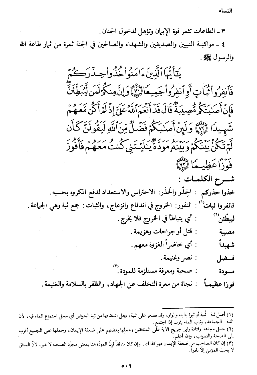 {يَا أَيُّهَا الَّذِينَ آمَنُوا خُذُوا حِذْرَكُمْ فَانْفِرُوا ثُبَاتٍ أَوِ انْفِرُوا جَمِيعاً (71) وَإِنَّ مِنْكُمْ لَمَنْ لَيُبَطِّئَنَّ فَإِنْ أَصَابَتْكُمْ مُصِيبَةٌ قَالَ قَدْ أَنْعَمَ اللهُ عَلَيَّ إِذْ لَمْ أَكُنْ مَعَهُمْ شَهِيداً (72) وَلَئِنْ أَصَابَكُمْ فَضْلٌ مِنَ اللهِ لَيَقُولَنَّ كَأَنْ لَمْ تَكُنْ بَيْنَكُمْ وَبَيْنَهُ مَوَدَّةٌ يَا لَيْتَنِي كُنْتُ مَعَهُمْ فَأَفُوزَ فَوْزاً عَظِيماً (73) }