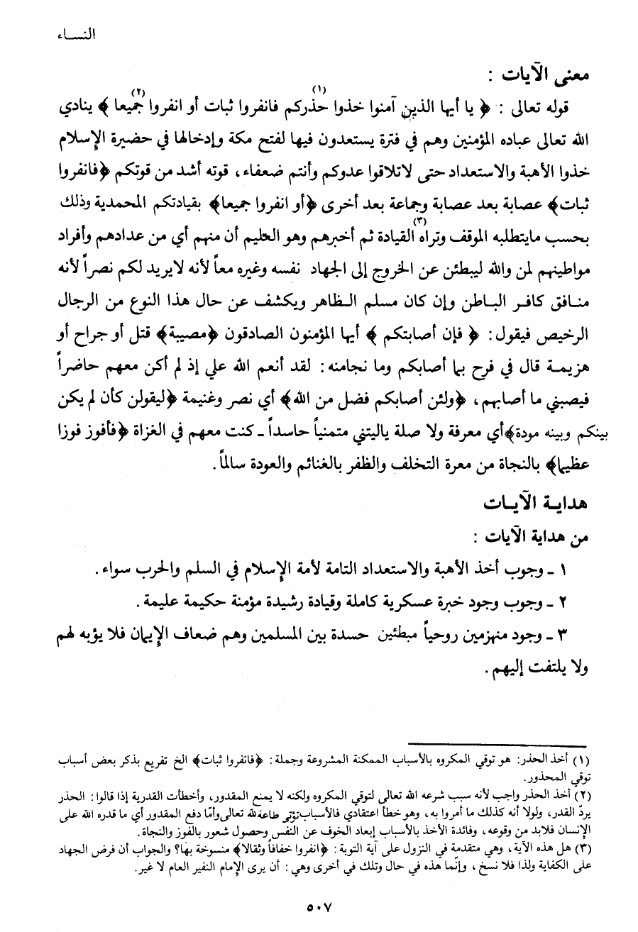 قوله تعالى: {يَا أَيُّهَا الَّذِينَ آمَنُوا خُذُوا حِذْرَكُمْ1 فَانْفِرُوا ثُبَاتٍ أَوِ انْفِرُوا جَمِيعاً2} ينادي الله تعالى عباده المؤمنين، وهم في فترة يستعدون فيها لفتح مكة وإدخاله في حظيرة الإسلام، خذوا الأهبة والاستعداد حتى لا تلاقوا عدوكم وأنتم ضعفاء، قوته أشد من قوتكم {فانفروا ثباتٍ} عصابة بعد عصابة وجماعة بعد أخرى {أَوِ انْفِرُوا جَمِيعاً} بقيادتكم المحمدية وذلك بحسب ما يتطلبه الموقف وتراه3 القيادة ثم أخبرهم وهو العليم أن منهم، أي: من عدادهم وأفراد مواطنيهم لمن والله ليبطئن عن الخروج إلى الجهاد نفسه وغيره معاً؛ لأنه لا يريد لكم نصراً لأنه منافق كافر الباطن وإن كان مسلم الظاهر ويكشف عن حال هذا النوع من الرجال الرخيص فيقول: {فَإِنْ أَصَابَتْكُمْ} أيها المؤمنون الصادقون {مُصِيبَةٌ} قتل أو جراح أو هزيمة قال في فرح بما أصابكم وما نجا منه: لقد أنعم الله عليَّ إذ لم أكن معهم حاضراً فيصيبني ما أصابهم، {وَلَئِنْ أَصَابَكُمْ فَضْلٌ مِنَ اللهِ} أي: نصر وغنيمة {لَيَقُولَنَّ كَأَنْ لَمْ تَكُنْ بَيْنَكُمْ وَبَيْنَهُ مَوَدَّةٌ} أي: معرفة ولا صلة يا ليتني متمنياً حاسداً –كنت معهم في الغزاة {فَأَفُوزَ فَوْزاً عَظِيماً} بالنجاة من معرة التخلف والظفر بالغنائم والعودة سالماً.