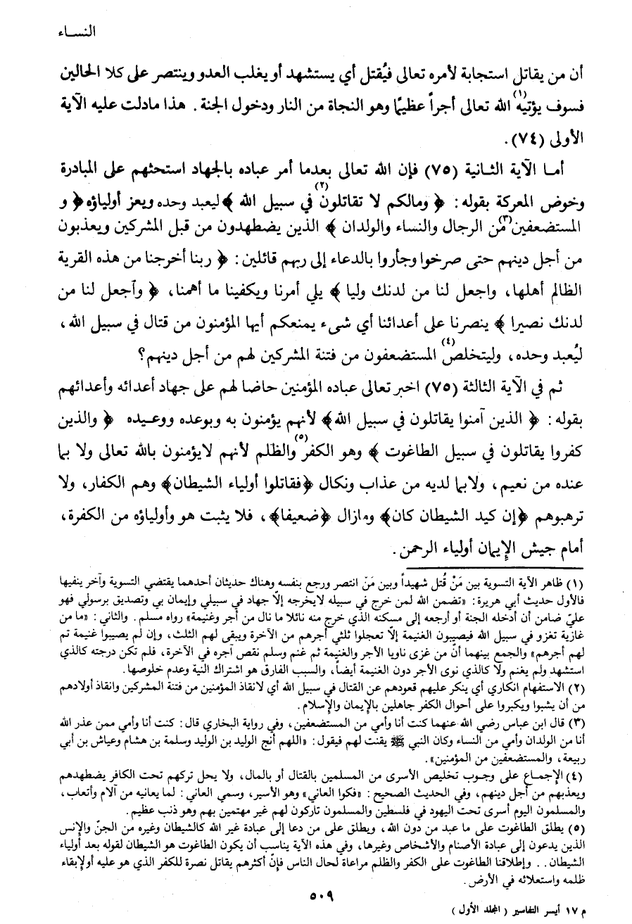 أما الآية الثانية (75) فإن الله تعالى بعدما أمر عباده بالجهاد استحثهم على المبادرة وخوض المعركة بقوله: {وَمَا لَكُمْ لا تُقَاتِلُونَ2 فِي سَبِيلِ اللهِ} ليعبد وحده ويعز أولياءه {وَالْمُسْتَضْعَفِينَ3 مِنَ الرِّجَالِ وَالنِّسَاءِ وَالْوِلْدَانِ} الذين يضطهدون من قبل المشركين ويعذبون من أجل دينهم حتى صرخوا وجاروا بالدعاء إلى ربهم قائلين: {رَبَّنَا أَخْرِجْنَا مِنْ هَذِهِ الْقَرْيَةِ الظَّالِمِ أَهْلُهَا وَاجْعَلْ لَنَا مِنْ لَدُنْكَ وَلِيّاً} بلى أمرنا ويكفينا ما أهمنا، {وَاجْعَلْ لَنَا مِنْ لَدُنْكَ نَصِيراً} ينصرنا على أعدائنا، أي: شيء يمنعكم أيها المؤمنون من قتال في سبيل الله، لُيعبد وحده، وليتخلص4 المستضعفون من فتنة المشركين لهم من أجل دينهم؟