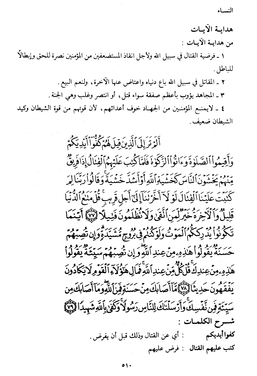 {أَلَمْ تَرَ إِلَى الَّذِينَ قِيلَ لَهُمْ كُفُّوا أَيْدِيَكُمْ وَأَقِيمُوا الصَّلاةَ وَآتُوا الزَّكَاةَ فَلَمَّا كُتِبَ عَلَيْهِمُ الْقِتَالُ إِذَا فَرِيقٌ مِنْهُمْ يَخْشَوْنَ النَّاسَ كَخَشْيَةِ اللهِ أَوْ أَشَدَّ خَشْيَةً وَقَالُوا رَبَّنَا لِمَ كَتَبْتَ عَلَيْنَا الْقِتَالَ لَوْلا أَخَّرْتَنَا إِلَى أَجَلٍ قَرِيبٍ قُلْ مَتَاعُ الدُّنْيَا قَلِيلٌ وَالآخِرَةُ خَيْرٌ لِمَنِ اتَّقَى وَلا تُظْلَمُونَ فَتِيلاً (77) أَيْنَمَا تَكُونُوا يُدْرِكْكُمُ الْمَوْتُ وَلَوْ كُنْتُمْ فِي بُرُوجٍ مُشَيَّدَةٍ وَإِنْ تُصِبْهُمْ حَسَنَةٌ يَقُولُوا هَذِهِ مِنْ عِنْدِ اللهِ وَإِنْ تُصِبْهُمْ سَيِّئَةٌ يَقُولُوا هَذِهِ مِنْ عِنْدِكَ قُل كُلٌّ مِنْ عِنْدِ اللهِ فَمَالِ هَؤُلاءِ الْقَوْمِ لا يَكَادُونَ يَفْقَهُونَ حَدِيثاً (78) مَا أَصَابَكَ مِنْ حَسَنَةٍ فَمِنَ اللهِ وَمَا أَصَابَكَ مِنْ سَيِّئَةٍ فَمِنْ نَفْسِكَ وَأَرْسَلْنَاكَ لِلنَّاسِ رَسُولاً وَكَفَى بِاللهِ شَهِيداً (79) }