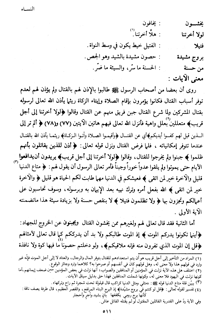 روى أن بعضاً من أصحاب الرسول صَلَّى اللهُ عَلَيْهِ وَسَلَّمَ طالبوا بالإذن لهم بالقتال ولم يؤذن لهم لعدم توفر أسباب القتال، فكانوا يؤمرون بإقام الصلاة وإيتاء الزكاة ريثما بأذن الله تعالى لرسوله بقتال المشركين، ولما شرع القتال جبن فريق منهم عن القتال وقالوا: {لَوْلا أَخَّرْتَنَا إِلَى أَجَلٍ قَرِيبٍ} متعللين2 بعلل واهية، فأنزل الله تعالى فيهم هاتين الآيتين (77) و (78) {أَلَمْ تَرَ إِلَى الَّذِينَ قِيلَ لَهُمْ كُفُّوا أَيْدِيَكُمْ} أي: عن القتال {وَأَقِيمُوا الصَّلاةَ وَآتُوا الزَّكَاةَ} ريثما يأذن الله بالقتال عندما تتوفر إمكانياته، فلما فرض القتال ونزل قوله تعالى: {أُذِنَ لِلَّذِينَ يُقَاتَلُونَ بِأَنَّهُمْ ظُلِمُوا} جبنوا ولم يخرجوا للقتال، وقالوا: {لَوْلا أَخَّرْتَنَا إِلَى أَجَلٍ قَرِيبٍ} يريدون أن يدافعوا الأيام حتى يموتوا ولم يلقوا عدواً خوراً، فأمر تعالى الرسول أن يقول لهم: {مَتَاعُ الدُّنْيَا3 قَلِيلٌ وَالآخِرَةُ خَيْرٌ لِمَنِ اتَّقَى} فعيشكم في الدنيا مهما طابت لكم الحياة هو قليل {وَالآخِرَةُ خَيْرٌ لِمَنِ اتَّقَى} الله بفعل أمره وترك نهيه بعد الإيمان به وبرسوله، وسوف تحاسبون على أعمالكم وتجزون بها {وَلا تُظْلَمُونَ فَتِيلاً} لا ينقص حسنة ولا بزيادة سيئة. هذا ما تضمنته الآية الأولى.