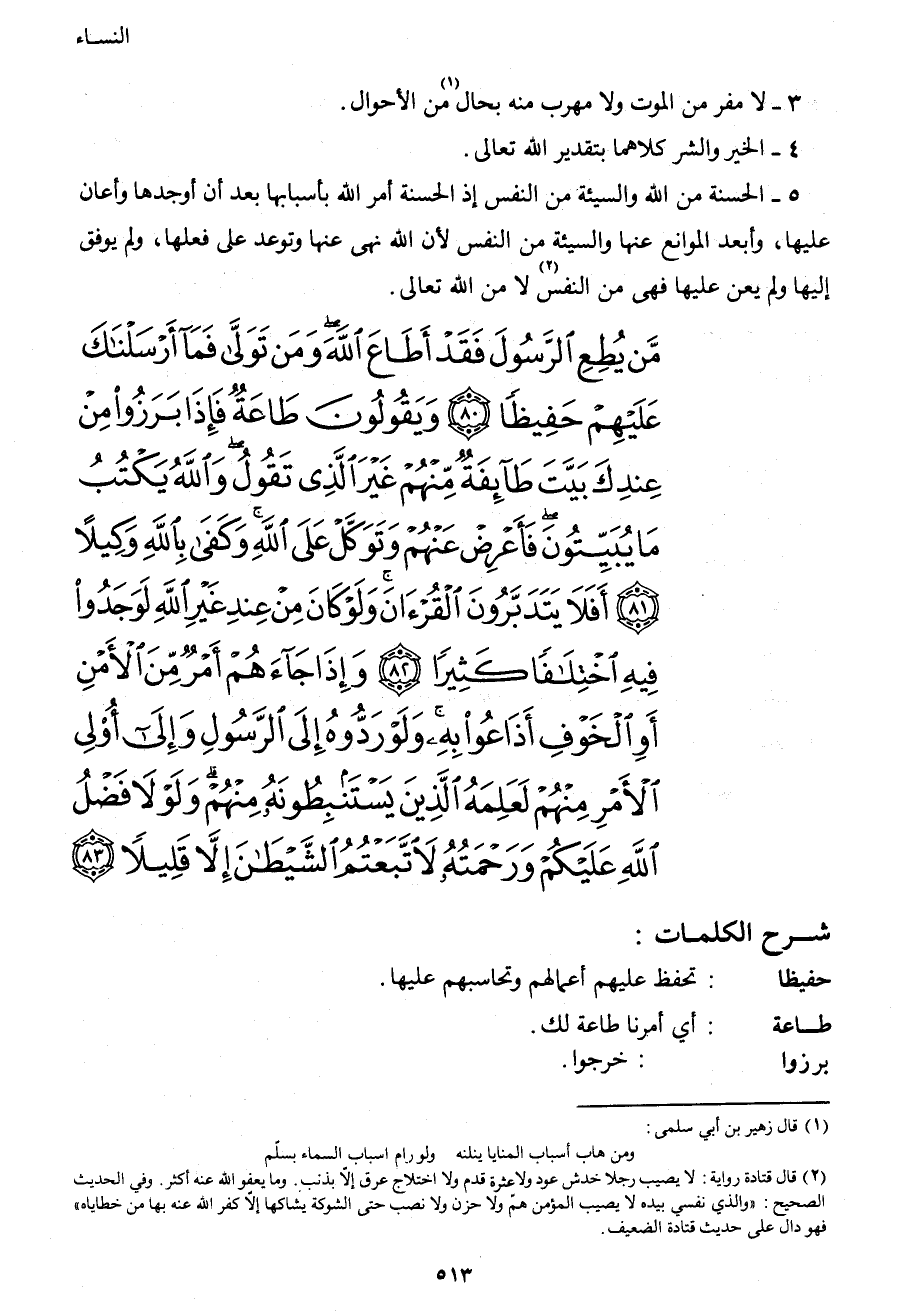 {مَنْ يُطِعِ الرَّسُولَ فَقَدْ أَطَاعَ اللهَ وَمَنْ تَوَلَّى فَمَا أَرْسَلْنَاكَ عَلَيْهِمْ حَفِيظاً (80) وَيَقُولُونَ طَاعَةٌ فَإِذَا بَرَزُوا مِنْ عِنْدِكَ بَيَّتَ طَائِفَةٌ مِنْهُمْ غَيْرَ الَّذِي تَقُولُ وَاللهُ يَكْتُبُ مَا يُبَيِّتُونَ فَأَعْرِضْ عَنْهُمْ وَتَوَكَّلْ عَلَى اللهِ وَكَفَى بِاللهِ وَكِيلاً (81) أَفَلا يَتَدَبَّرُونَ الْقُرْآنَ وَلَوْ كَانَ مِنْ عِنْدِ غَيْرِ اللهِ لَوَجَدُوا فِيهِ اخْتِلافاً كَثِيراً (82) وَإِذَا جَاءَهُمْ أَمْرٌ مِنَ الأَمْنِ أَوِ الْخَوْفِ أَذَاعُوا بِهِ وَلَوْ رَدُّوهُ إِلَى الرَّسُولِ وَإِلَى أُولِي الأَمْرِ مِنْهُمْ لَعَلِمَهُ الَّذِينَ يَسْتَنْبِطُونَهُ مِنْهُمْ وَلَوْلا فَضْلُ اللهِ عَلَيْكُمْ وَرَحْمَتُهُ لاتَّبَعْتُمُ الشَّيْطَانَ إِلا قَلِيلاً (83) }