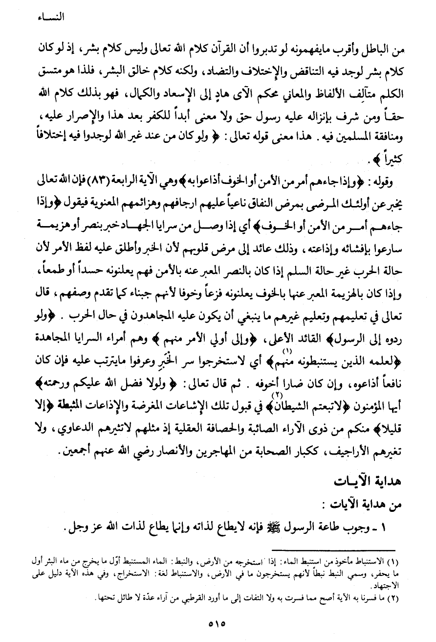 1 الاستنباط مأخوذ من: استنبط الماء، إذا استخرجه من الأرض، والنبط: الماء المستنبط أول ما يخرج من ماء البئر أو ما يحفر. وسمي النبط نبطاً؛ لأنهم يستخرجون ما في الأرض، والاستنباط لغة الاستخراج، وفي هذه الآية دليل على الاجتهاد.