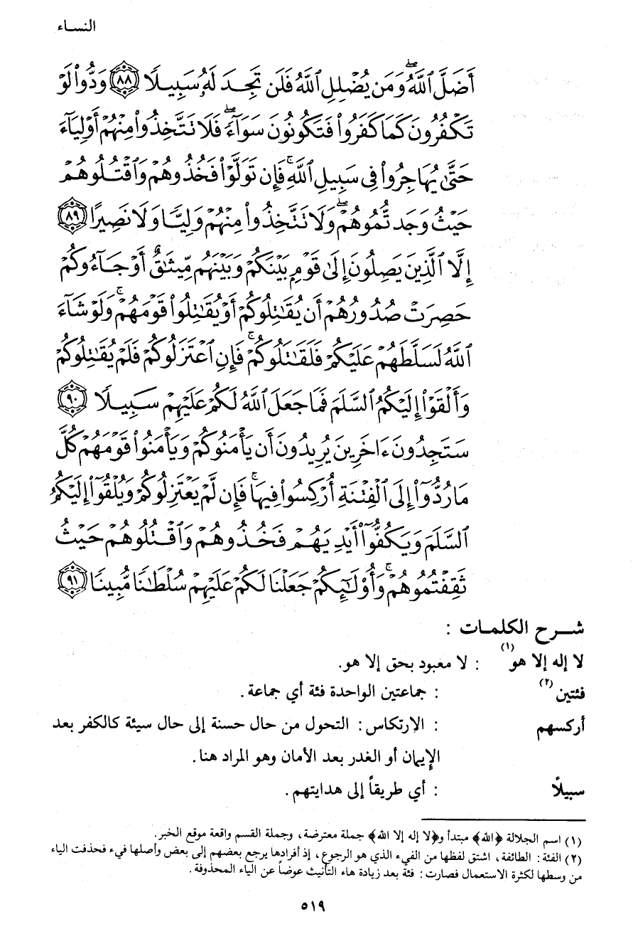 أَضَلَّ اللهُ وَمَنْ يُضْلِلِ اللهُ فَلَنْ تَجِدَ لَهُ سَبِيلاً (88) وَدُّوا لَوْ تَكْفُرُونَ كَمَا كَفَرُوا فَتَكُونُونَ سَوَاءً فَلا تَتَّخِذُوا مِنْهُمْ أَوْلِيَاءَ حَتَّى يُهَاجِرُوا فِي سَبِيلِ اللهِ فَإِنْ تَوَلَّوْا فَخُذُوهُمْ وَاقْتُلُوهُمْ حَيْثُ وَجَدْتُمُوهُمْ وَلا تَتَّخِذُوا مِنْهُمْ وَلِيّاً وَلا نَصِيراً (89) إِلا الَّذِينَ يَصِلُونَ إِلَى قَوْمٍ بَيْنَكُمْ وَبَيْنَهُمْ مِيثَاقٌ أَوْ جَاءُوكُمْ حَصِرَتْ صُدُورُهُمْ أَنْ يُقَاتِلُوكُمْ أَوْ يُقَاتِلُوا قَوْمَهُمْ وَلَوْ شَاءَ اللهُ لَسَلَّطَهُمْ عَلَيْكُمْ فَلَقَاتَلُوكُمْ فَإِنِ اعْتَزَلُوكُمْ فَلَمْ يُقَاتِلُوكُمْ وَأَلْقَوْا إِلَيْكُمُ السَّلَمَ فَمَا جَعَلَ اللهُ لَكُمْ عَلَيْهِمْ سَبِيلاً (90) سَتَجِدُونَ آخَرِينَ يُرِيدُونَ أَنْ يَأْمَنُوكُمْ وَيَأْمَنُوا قَوْمَهُمْ كُلَّ مَا رُدُّوا إِلَى الْفِتْنَةِ أُرْكِسُوا فِيهَا فَإِنْ لَمْ يَعْتَزِلُوكُمْ وَيُلْقُوا إِلَيْكُمُ السَّلَمَ وَيَكُفُّوا أَيْدِيَهُمْ فَخُذُوهُمْ وَاقْتُلُوهُمْ حَيْثُ ثَقِفْتُمُوهُمْ وَأُولَئِكُمْ جَعَلْنَا لَكُمْ عَلَيْهِمْ سُلْطَاناً مُبِيناً (91) }