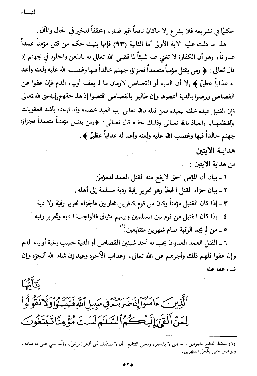 هذا ما دلت عليه الآية الأولى، أما الآية الثانية (93) فإنها بينت حكم من قتل مؤمناً عمداً عدواناً، وهو أن الكفارة لا تغني عنه شيئاً لما قضى الله تعالى له باللعن والخلود في جهنم إذ قال تعالى: {وَمَنْ يَقْتُلْ مُؤْمِناً مُتَعَمِّداً فَجَزَاؤُهُ جَهَنَّمُ خَالِداً فِيهَا وَغَضِبَ اللهُ عَلَيْهِ وَلَعَنَهُ وَأَعَدَّ لَهُ عَذَاباً عَظِيماً} إلا أن الدية أو القصاص لازمان ما لم يعف أولياء الدم فإن عفوا عن القصاص ورضوا بالدية أعطوها وإن طالبوا بالقصاص اقتصوا، إذ هذا حقهم وأما حق الله تعالى: فإن القتيل عبده خلقه ليعبده، فمن قتله، فالله تعالى رب العبد خصمه وقد توعده بأشد العقوبات وأفظعها، والعياذ بالله تعالى وذلك حقه قال تعالى: {وَمَنْ يَقْتُلْ مُؤْمِناً مُتَعَمِّداً فَجَزَاؤُهُ جَهَنَّمُ خَالِداً فِيهَا وَغَضِبَ اللهُ عَلَيْهِ وَلَعَنَهُ وَأَعَدَّ لَهُ عَذَاباً عَظِيماً} .