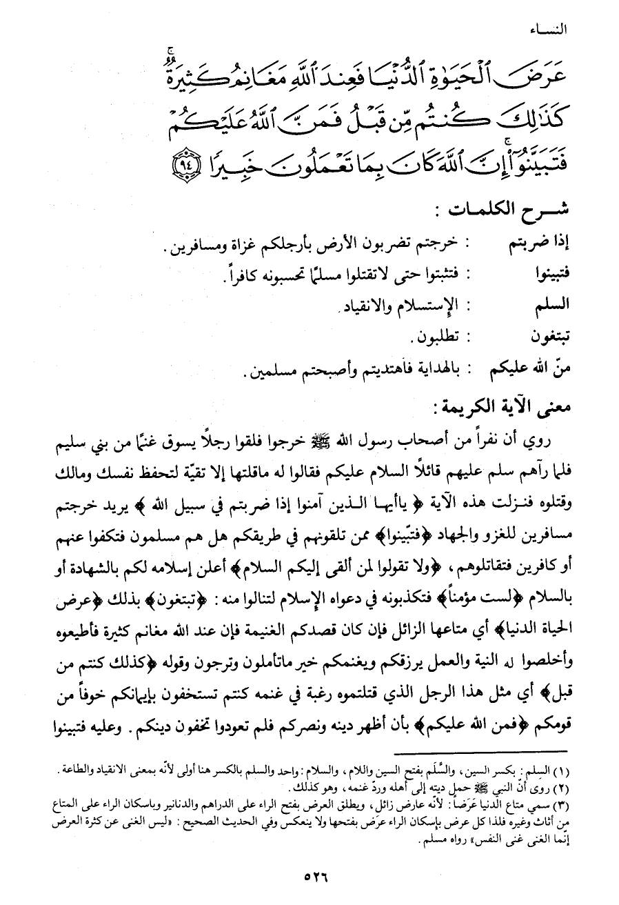 عَرَضَ الْحَيَاةِ الدُّنْيَا فَعِنْدَ اللهِ مَغَانِمُ كَثِيرَةٌ كَذَلِكَ كُنْتُمْ مِنْ قَبْلُ فَمَنَّ اللهُ عَلَيْكُمْ فَتَبَيَّنُوا إِنَّ اللهَ كَانَ بِمَا تَعْمَلُونَ خَبِيراً (94) }