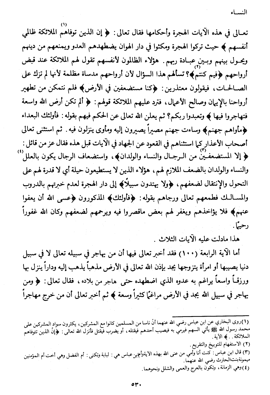 1 روى البخاري عن ابن عباس رضي الله عنهما أن ناساً من المسلمين كانوا مع المشركين يكثرون سواد المشركين على محمد صَلَّى اللهُ عَلَيْهِ وَسَلَّمَ، يأتي السهم فيرمي به فيصيب أحدهم فيقتله أو يضرب فيقتل، فأنزل الله تعالى: {إِنَّ الَّذِينَ تَوَفَّاهُمُ الْمَلائِكَةُ..} الآية.
