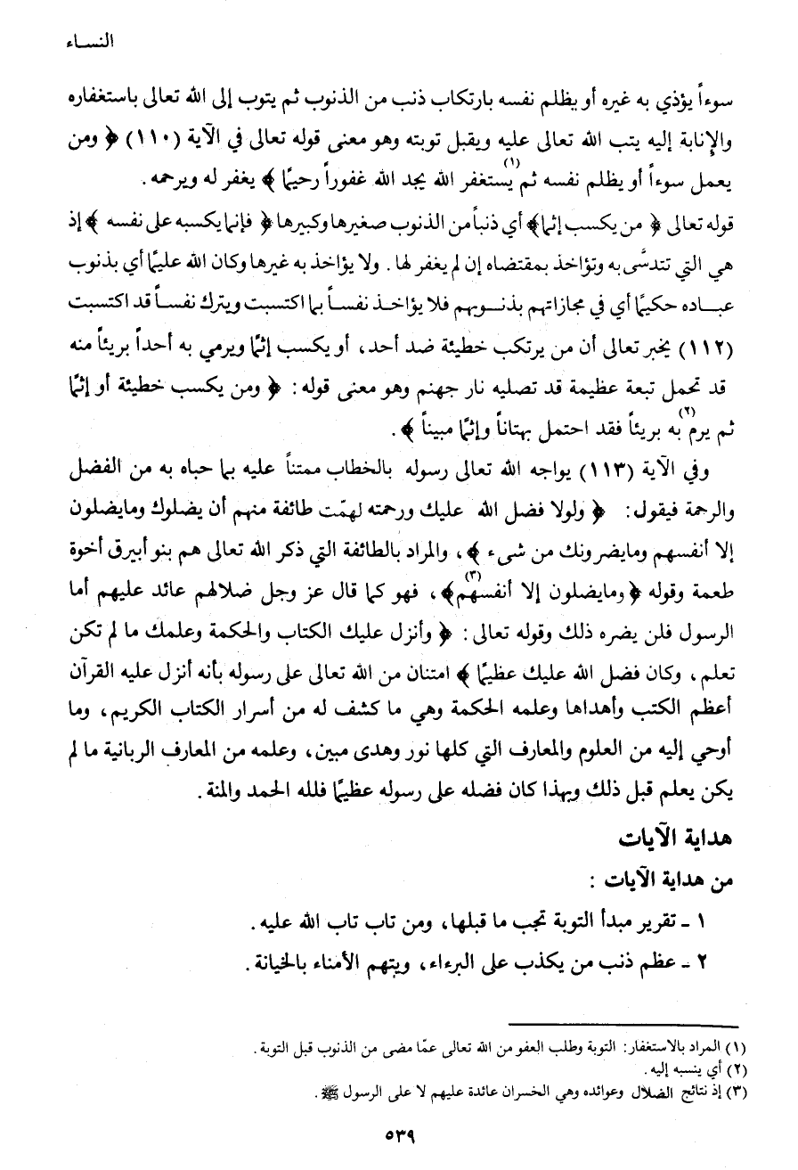 وفي الآية (113) يواجه الله تعالى رسوله بالخطاب ممتنا ًعليه بما حباه به من الفضل والرحمة فيقول: {وَلَوْلا فَضْلُ اللهِ عَلَيْكَ وَرَحْمَتُهُ لَهَمَّتْ طَائِفَةٌ مِنْهُمْ أَنْ يُضِلُّوكَ وَمَا يُضِلُّونَ إِلا أَنْفُسَهُمْ وَمَا يَضُرُّونَكَ مِنْ شَيْءٍ} ، والمراد بالطائفة التي ذكر الله تعالى هم بنو أبيرق أخوة طعمة وقوله: {وَمَا يُضِلُّونَ إِلا أَنْفُسَهُمْ3} ، فهو كما قال عز وجل ضلالهم عائد عليهم أما الرسول فلن يضره ذلك وقوله تعالى: {وَأَنْزَلَ اللهُ عَلَيْكَ الْكِتَابَ وَالْحِكْمَةَ وَعَلَّمَكَ مَا لَمْ تَكُنْ تَعْلَمُ وَكَانَ فَضْلُ اللهِ عَلَيْكَ عَظِيماً} امتنان من الله تعالى على رسوله بأنه أنزل عليه القرآن أعظم الكتب وأهداها وعلمه الحكمة وهي ما كشف له من أسرار الكتاب الكريم، وما أوحى إليه من العلوم والمعارف التي كلها نور وهدى مبين، وعلمه من المعارف الربانية ما لم يكن يعلم قبل ذلك وبهذا كان فضله على رسوله عظيماً، فلله الحمد والمنة.