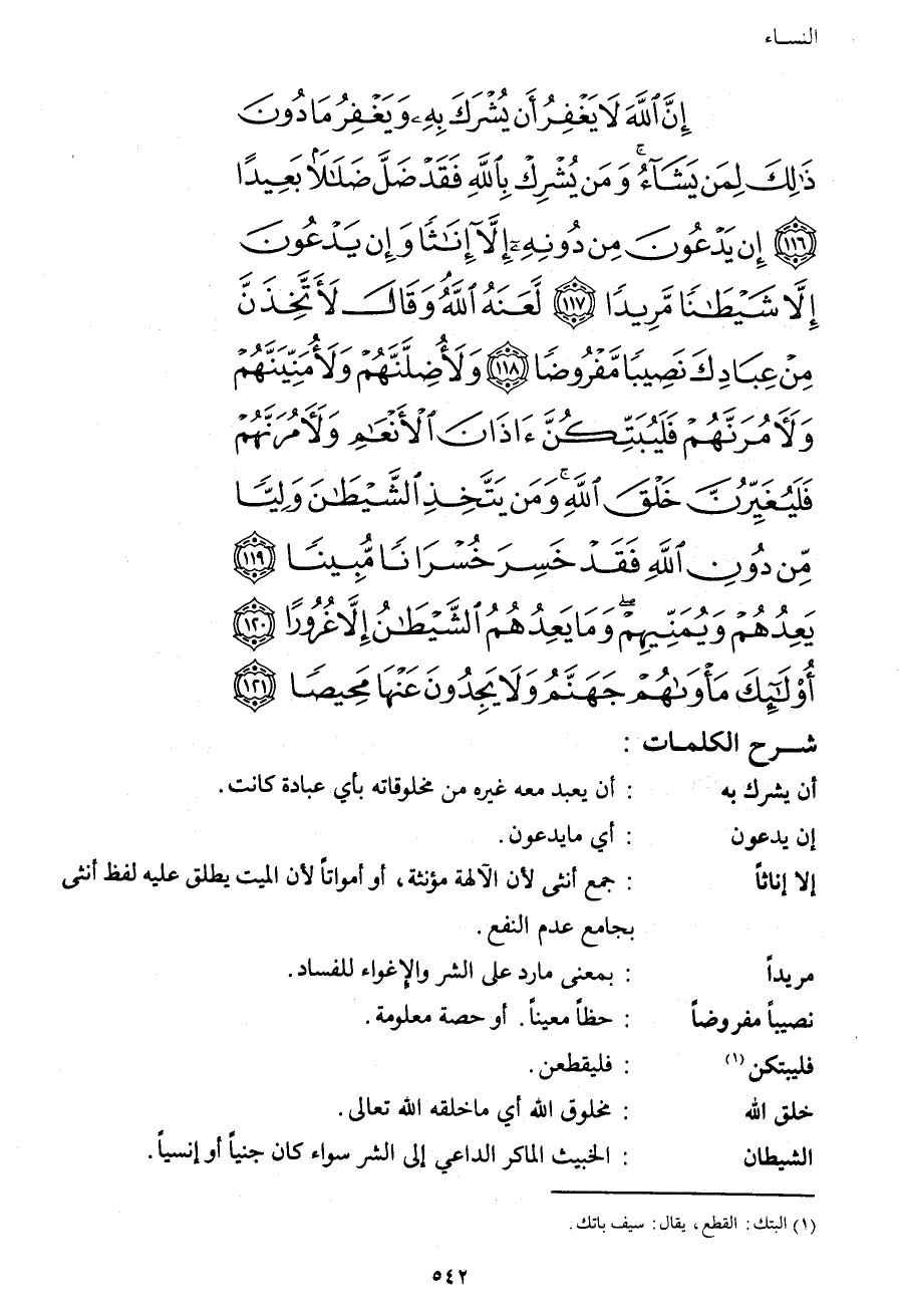 {إِنَّ اللهَ لا يَغْفِرُ أَنْ يُشْرَكَ بِهِ وَيَغْفِرُ مَا دُونَ ذَلِكَ لِمَنْ يَشَاءُ وَمَنْ يُشْرِكْ بِاللهِ فَقَدْ ضَلَّ ضَلالاً بَعِيداً (116) إِنْ يَدْعُونَ مِنْ دُونِهِ إِلا إِنَاثاً وَإِنْ يَدْعُونَ إِلا شَيْطَاناً مَرِيداً (117) لَعَنَهُ اللهُ وَقَالَ لأَتَّخِذَنَّ مِنْ عِبَادِكَ نَصِيباً مَفْرُوضاً (118) وَلأُضِلَّنَّهُمْ وَلأُمَنِّيَنَّهُمْ وَلآمُرَنَّهُمْ فَلَيُبَتِّكُنَّ آذَانَ الأَنْعَامِ وَلآمُرَنَّهُمْ فَلَيُغَيِّرُنَّ خَلْقَ اللهِ وَمَنْ يَتَّخِذِ الشَّيْطَانَ وَلِيّاً مِنْ دُونِ اللهِ فَقَدْ خَسِرَ خُسْرَاناً مُبِيناً (119) يَعِدُهُمْ وَيُمَنِّيهِمْ وَمَا يَعِدُهُمُ الشَّيْطَانُ إِلا غُرُوراً (120) أُولَئِكَ مَأْوَاهُمْ جَهَنَّمُ وَلا يَجِدُونَ عَنْهَا مَحِيصاً (121) }