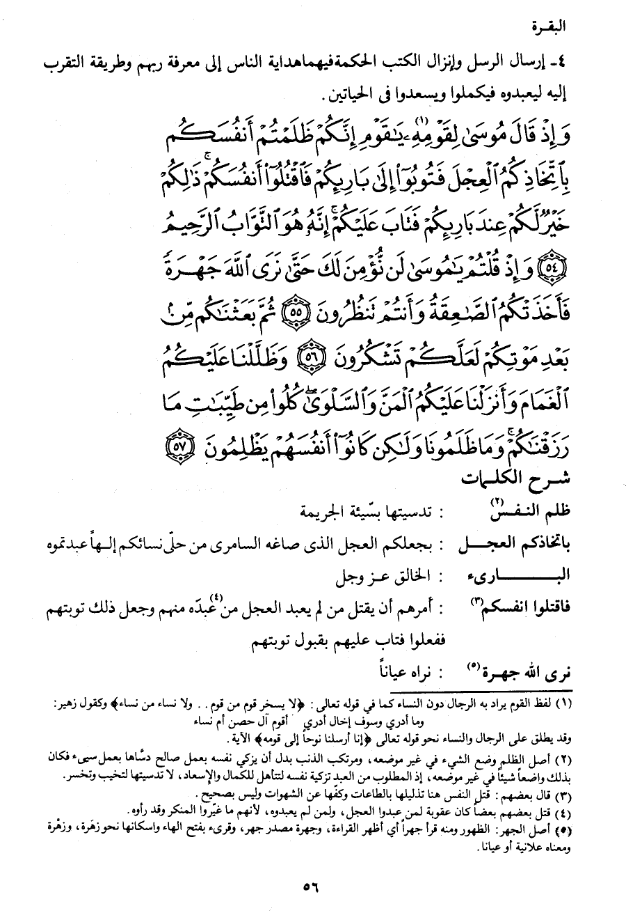 {وَإِذْ قَالَ مُوسَى لِقَوْمِهِ1 يَا قَوْمِ إِنَّكُمْ ظَلَمْتُمْ أَنْفُسَكُمْ بِاتِّخَاذِكُمُ الْعِجْلَ فَتُوبُوا إِلَى بَارِئِكُمْ فَاقْتُلُوا أَنْفُسَكُمْ ذَلِكُمْ خَيْرٌ لَكُمْ عِنْدَ بَارِئِكُمْ فَتَابَ عَلَيْكُمْ إِنَّهُ هُوَ التَّوَّابُ الرَّحِيم (54) وَإِذْ قُلْتُمْ يَا مُوسَى لَنْ نُؤْمِنَ لَكَ حَتَّى نَرَى اللهَ جَهْرَةً فَأَخَذَتْكُمُ الصَّاعِقَةُ وَأَنْتُمْ تَنْظُرُونَ (55) ثُمَّ بَعَثْنَاكُمْ مِنْ بَعْدِ مَوْتِكُمْ لَعَلَّكُمْ تَشْكُرُونَ (56) وَظَلَّلْنَا عَلَيْكُمُ الْغَمَامَ وَأَنْزَلْنَا عَلَيْكُمُ الْمَنَّ وَالسَّلْوَى كُلُوا مِنْ طَيِّبَاتِ مَا رَزَقْنَاكُمْ وَمَا ظَلَمُونَا وَلَكِنْ كَانُوا أَنْفُسَهُمْ يَظْلِمُونَ (57) }