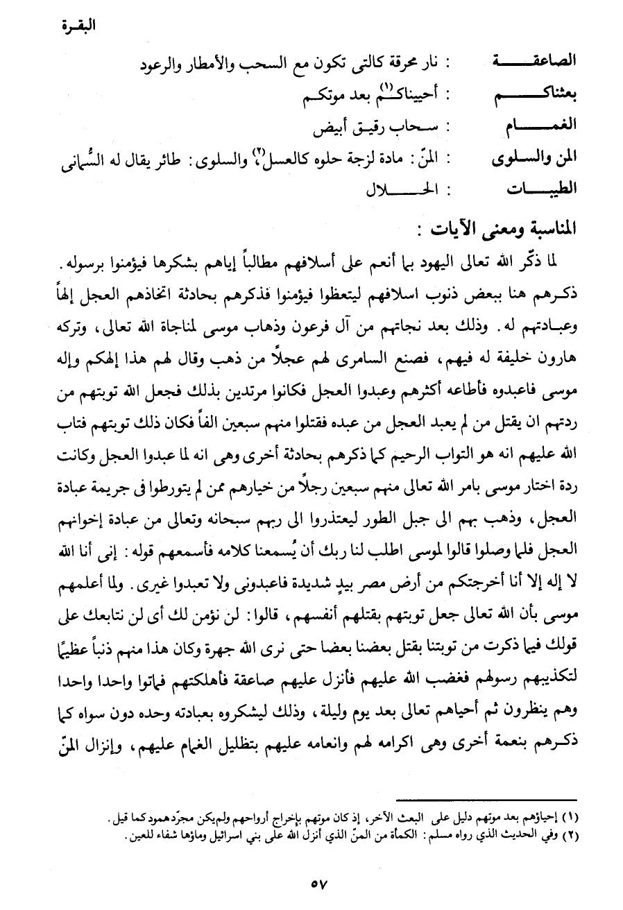 لما ذكر الله تعالى اليهود بما أنعم على أسلافهم مطالباً إياهم بشكرها فيؤمنوا برسوله. ذكرهم هنا ببعض ذنوب أسلافهم ليتعظوا فيؤمنوا، فذكرهم بحادثة اتخاذهم العجل إلهاً وعبادتهم له. وذلك بعد نجاتهم من آل فرعون وذهاب موسى لمناجاة الله تعالى، وتركه هارون خليفة له فيهم، فصنع السامري لهم عجلاً من ذهب وقال لهم هذا إلهكم وإله موسى فاعبدوه، فأطاعوه أكثرهم وعبدوا العجل، فكانوا مرتدين بذلك فجعل الله توبتهم من ردتهم أن يقتل من لم يعبد العجل من عبدَه فقتلوا منهم سبعين ألفاً، فكان ذلك توبتهم فتاب الله عليهم إنه هو التواب الرحيم، كما ذكرهم بحادثة أخرى وهي: إنه لما عبدوا العجل وكانت ردة اختار موسى بأمر الله تعالى منهم سبعين رجلاً من خيارهم ممن لم يتورطوا في جريمة عبادة العجل، وذهب بهم إلى جبل الطور ليعتذروا إلى ربهم سبحانه وتعالى من عبادة إخوانهم العجل فلما وصلوا قالوا لموسى اطلب لنا ربك أن يسمعنا كلامه، فأسمعهم قوله: {إِنِّي أَنَا اللهُ} لا إله إلا أنا أخرجتكم من أرض مصر بيدٍ شديدة فاعبدوني ولا تعبدوا غيري. ولما أعلمهم موسى بأن الله تعالى جعل توبتهم وقتلهم أنفسهم، قالوا: لن نؤمن لك، أي لن نتابعك على قولك فيما ذكرت من توبتنا بقتل بعضنا بعضا حتى نرى الله جهرة، وكان هذا منهم ذنباً عظيماً لتكذيبهم رسولهم فغضب الله عليهم فأنزل عليهم صاعقة فأهلكتهم فماتوا واحداً واحداً وهم ينظرون ثم أحياهم تعالى بعد يوم وليلة، وذلك ليشكروه بعبادته وحده دون سواه كما ذكرهم بنعمة أخرى، وهي إكرامه لهم وإنعامه عليهم بتظليل الغمام عليهم، وإنزال المن