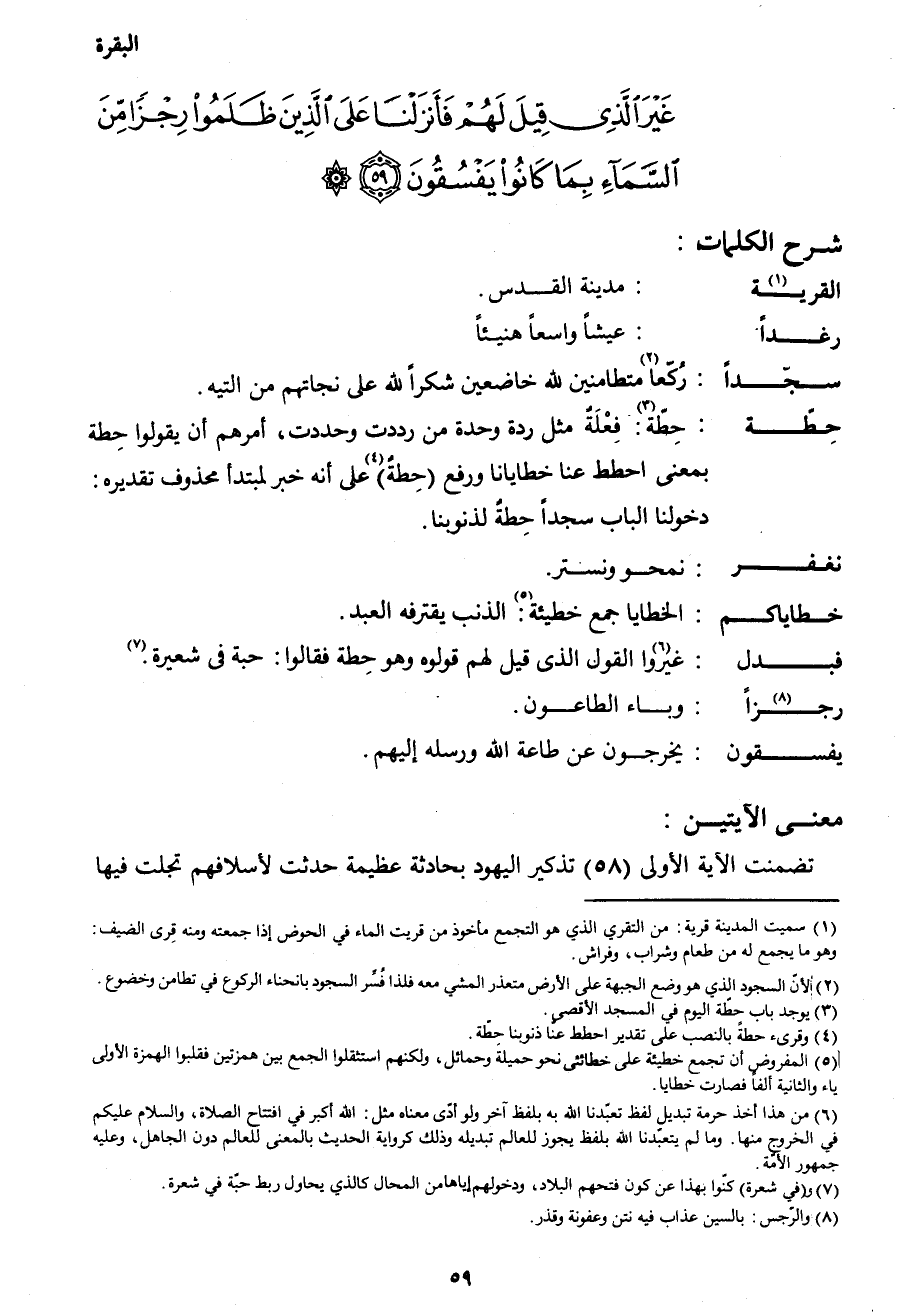 غَيْرَ الَّذِي قِيلَ لَهُمْ فَأَنْزَلْنَا عَلَى الَّذِينَ ظَلَمُوا رِجْزاً مِنَ السَّمَاءِ بِمَا كَانُوا يَفْسُقُونَ (59) }