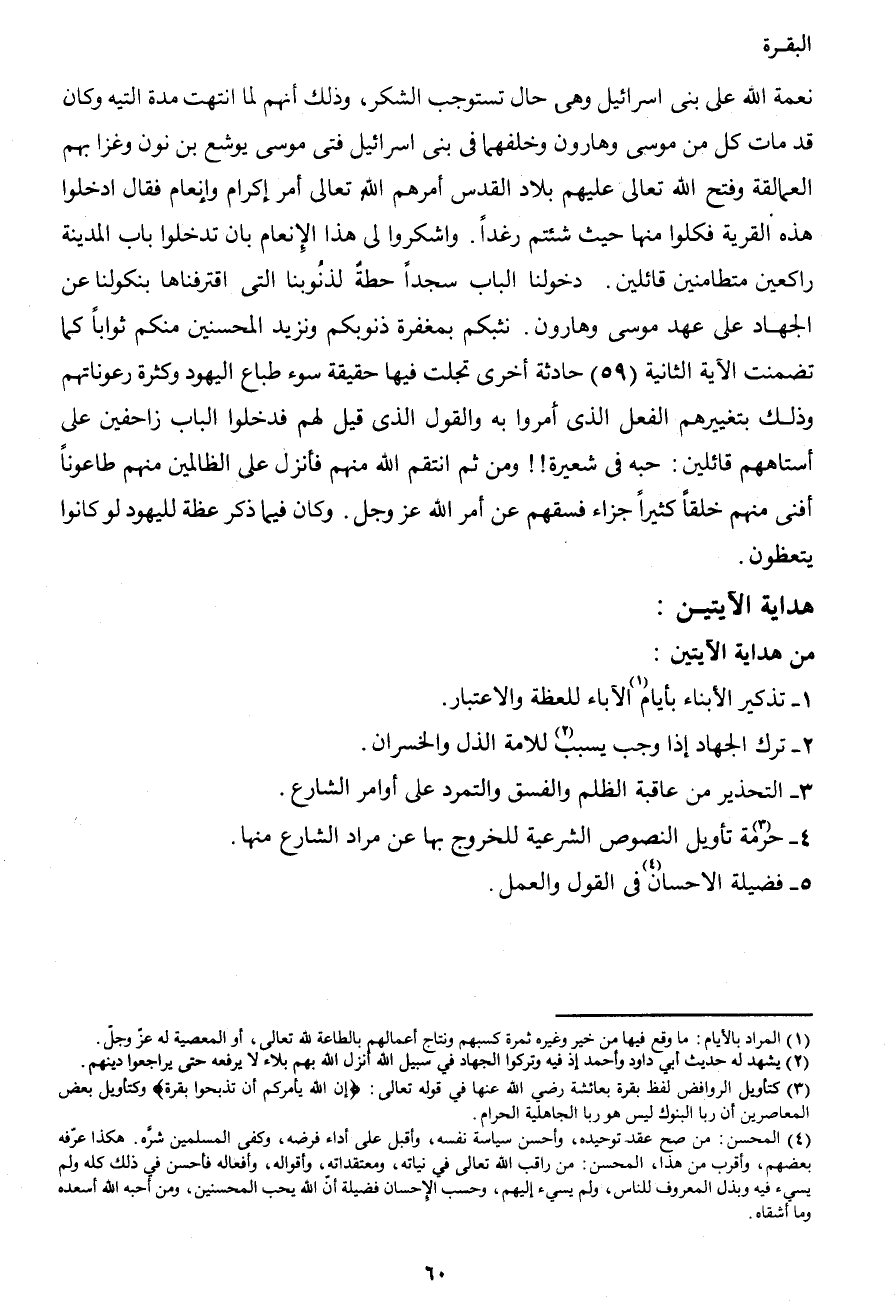 نعمة الله على بني إسرائيل وهي: حال تستوجب الشكر، وذلك إنهم لما انتهت مدة التيه وكان قد مات كل من: موسى وهارون، وخلفهم في بني إسرائيل فتى موسى يوشع بن نون، وغزا بهم العمالقة وفتح الله تعالى عليهم بلاد القدس أمرهم الله تعالى أمر إكرام وإنعام فقال ادخلوا هذه القرية فكلوا منها حيث شئتم رغدا. واشكروا لي هذه الأنعام بأن تدخلوا باب المدينة راكعين متطامنين قائلين. دخولنا الباب سجداً حطة لذنوبنا التي اقترفناها بنقولنا عن الجهاد على عهد موسى وهارون. نثبكم بمغفرة ذنوبكم ونزيد المحسنين منكم ثواباً كما تضمنت الآية الثانية (59) حادثة أخرى تجلت فيها حقيقة سوء طباع اليهود وكثرة رعوناتهم وذلك بتغييرهم الفعل الذي أمروا به والقول الذي قيل لهم فدخلوا الباب زاحفين على أستاههم قائلين: حبة في شعيرة!! ومن ثم انتقم الله منهم فانزل على الظالمين منهم طاعوناً أفنى منهم خلقاً كثيراً جزاء فسقهم عن أمر الله عز وجل. وكان فيما ذكر عظة لليهود لو كانوا يتعظون.