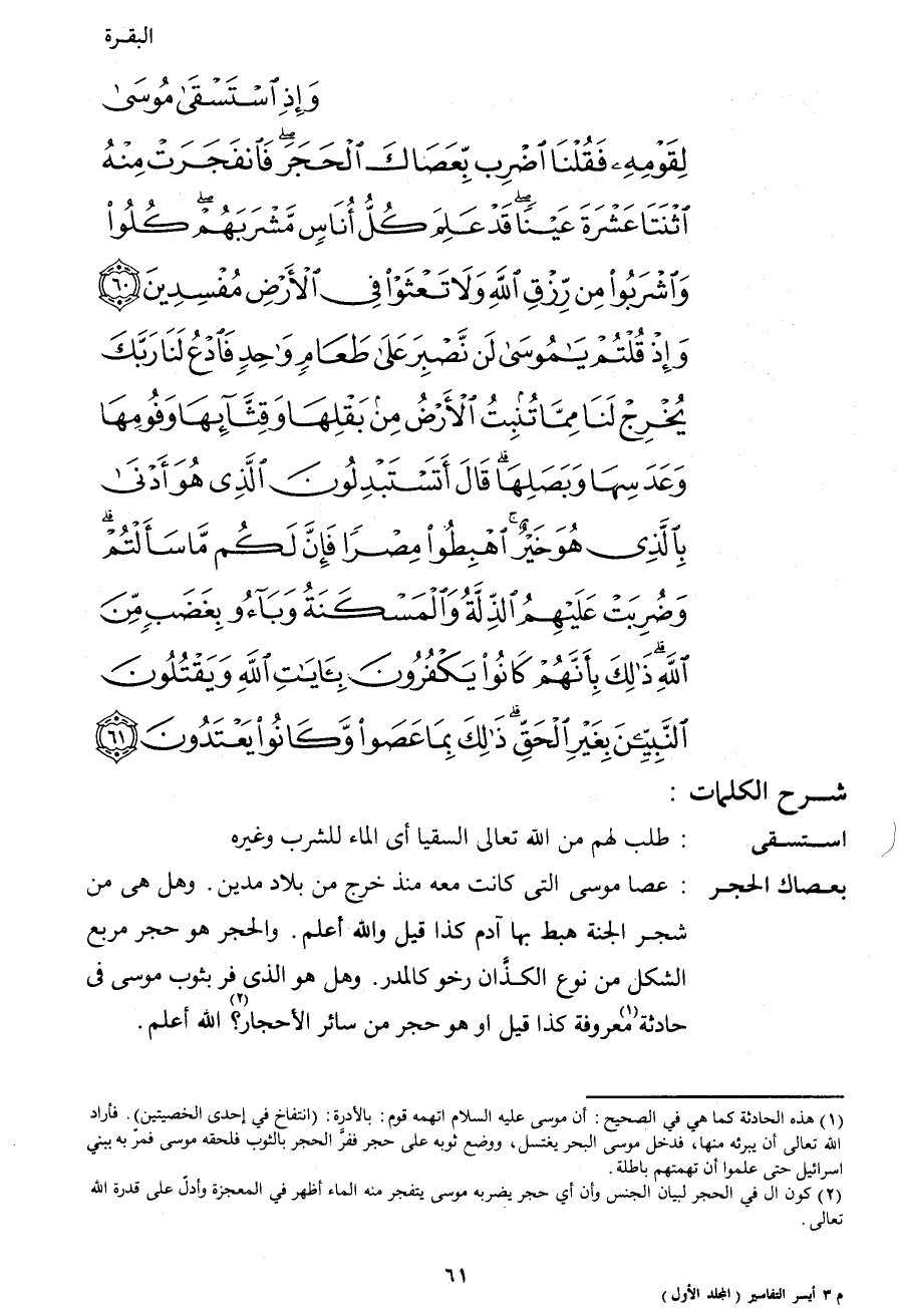 {وَإِذِ اسْتَسْقَى مُوسَى لِقَوْمِهِ فَقُلْنَا اضْرِبْ بِعَصَاكَ الْحَجَرَ فَانْفَجَرَتْ مِنْهُ اثْنَتَا عَشْرَةَ عَيْناً قَدْ عَلِمَ كُلُّ أُنَاسٍ مَشْرَبَهُمْ كُلُوا وَاشْرَبُوا مِنْ رِزْقِ اللهِ وَلا تَعْثَوْا فِي الأَرْضِ مُفْسِدِينَ (60) وَإِذْ قُلْتُمْ يَا مُوسَى لَنْ نَصْبِرَ عَلَى طَعَامٍ وَاحِدٍ فَادْعُ لَنَا رَبَّكَ يُخْرِجْ لَنَا مِمَّا تُنْبِتُ الأَرْضُ مِنْ بَقْلِهَا وَقِثَّائِهَا وَفُومِهَا وَعَدَسِهَا وَبَصَلِهَا قَالَ أَتَسْتَبْدِلُونَ الَّذِي هُوَ أَدْنَى بِالَّذِي هُوَ خَيْرٌ اهْبِطُوا مِصْراً فَإِنَّ لَكُمْ مَا سَأَلْتُمْ وَضُرِبَتْ عَلَيْهِمُ الذِّلَّةُ وَالْمَسْكَنَةُ وَبَاءُوا بِغَضَبٍ مِنَ اللهِ ذَلِكَ بِأَنَّهُمْ كَانُوا يَكْفُرُونَ بآيَاتِ اللهِ وَيَقْتُلُونَ النَّبِيِّينَ بِغَيْرِ الْحَقِّ ذَلِكَ بِمَا عَصَوْا وَكَانُوا يَعْتَدُونَ (61) }