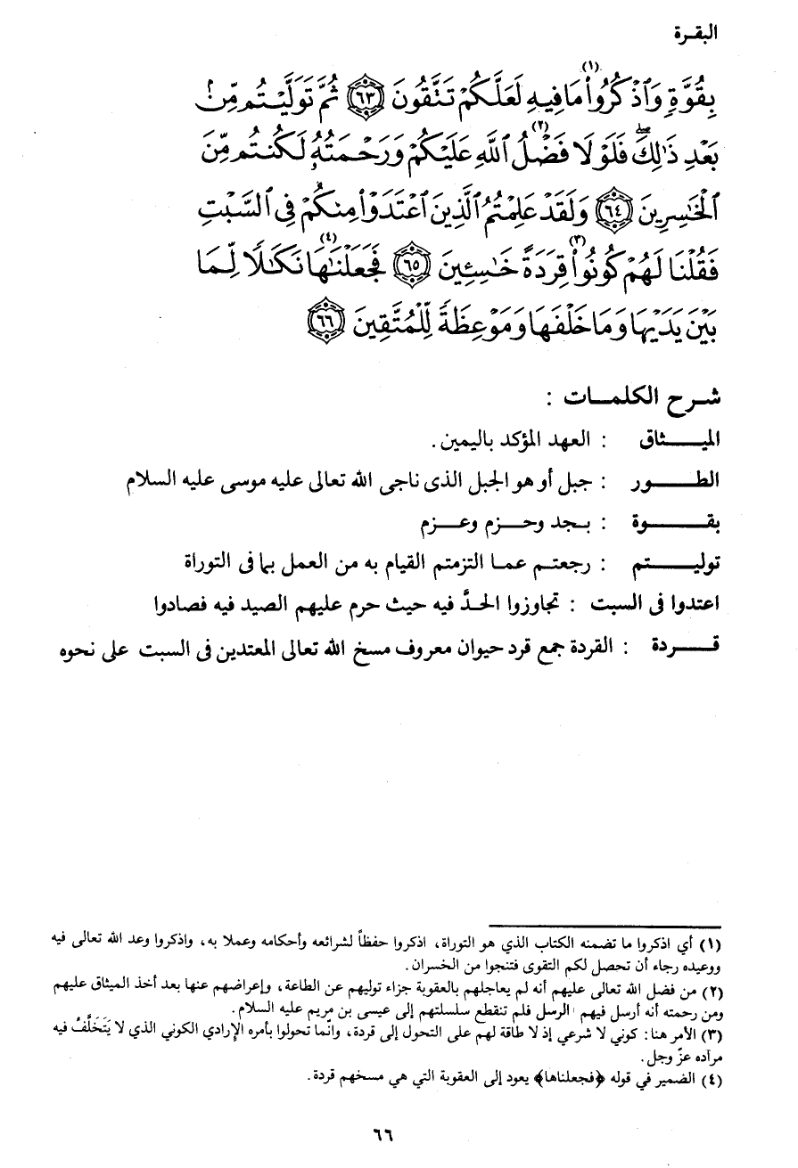 بِقُوَّةٍ وَاذْكُرُوا1 مَا فِيهِ لَعَلَّكُمْ تَتَّقُونَ (63) ثُمَّ تَوَلَّيْتُمْ مِنْ بَعْدِ ذَلِكَ فَلَوْلا فَضْلُ2 اللهِ عَلَيْكُمْ وَرَحْمَتُهُ لَكُنْتُمْ مِنَ الْخَاسِرِينَ (64) وَلَقَدْ عَلِمْتُمُ الَّذِينَ اعْتَدَوْا مِنْكُمْ فِي السَّبْتِ فَقُلْنَا لَهُمْ كُونُوا3 قِرَدَةً خَاسِئِينَ (65) فَجَعَلْنَاهَا4 نَكَالاً لِمَا بَيْنَ يَدَيْهَا وَمَا خَلْفَهَا وَمَوْعِظَةً لِلْمُتَّقِينَ (66) }