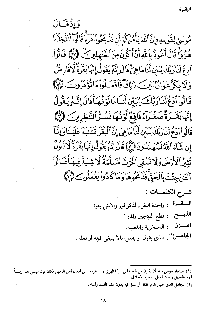{وَإِذْ قَالَ مُوسَى لِقَوْمِهِ إِنَّ اللهَ يَأْمُرُكُمْ أَنْ تَذْبَحُوا بَقَرَةً قَالُوا أَتَتَّخِذُنَا هُزُواً قَالَ أَعُوذُ بِاللهِ أَنْ أَكُونَ مِنَ الْجَاهِلِينَ1 (67) قَالُوا ادْعُ لَنَا رَبَّكَ يُبَيِّنْ لَنَا مَا هِيَ قَالَ إِنَّهُ يَقُولُ إِنَّهَا بَقَرَةٌ لا فَارِضٌ وَلا بِكْرٌ عَوَانٌ بَيْنَ ذَلِكَ فَافْعَلُوا مَا تُؤْمَرُونَ (68) قَالُوا ادْعُ لَنَا رَبَّكَ يُبَيِّنْ لَنَا مَا لَوْنُهَا قَالَ إِنَّهُ يَقُولُ إِنَّهَا بَقَرَةٌ صَفْرَاءُ فَاقِعٌ لَوْنُهَا تَسُرُّ النَّاظِرِينَ (69) قَالُوا ادْعُ لَنَا رَبَّكَ يُبَيِّنْ لَنَا مَا هِيَ إِنَّ الْبَقَرَ تَشَابَهَ عَلَيْنَا وَإِنَّا إِنْ شَاءَ اللهُ لَمُهْتَدُونَ (70) قَالَ إِنَّهُ يَقُولُ إِنَّهَا بَقَرَةٌ لا ذَلُولٌ تُثِيرُ الأَرْضَ وَلا تَسْقِي الْحَرْثَ مُسَلَّمَةٌ لا شِيَةَ فِيهَا قَالُوا الآنَ جِئْتَ بِالْحَقِّ فَذَبَحُوهَا وَمَا كَادُوا يَفْعَلُونَ (71) }