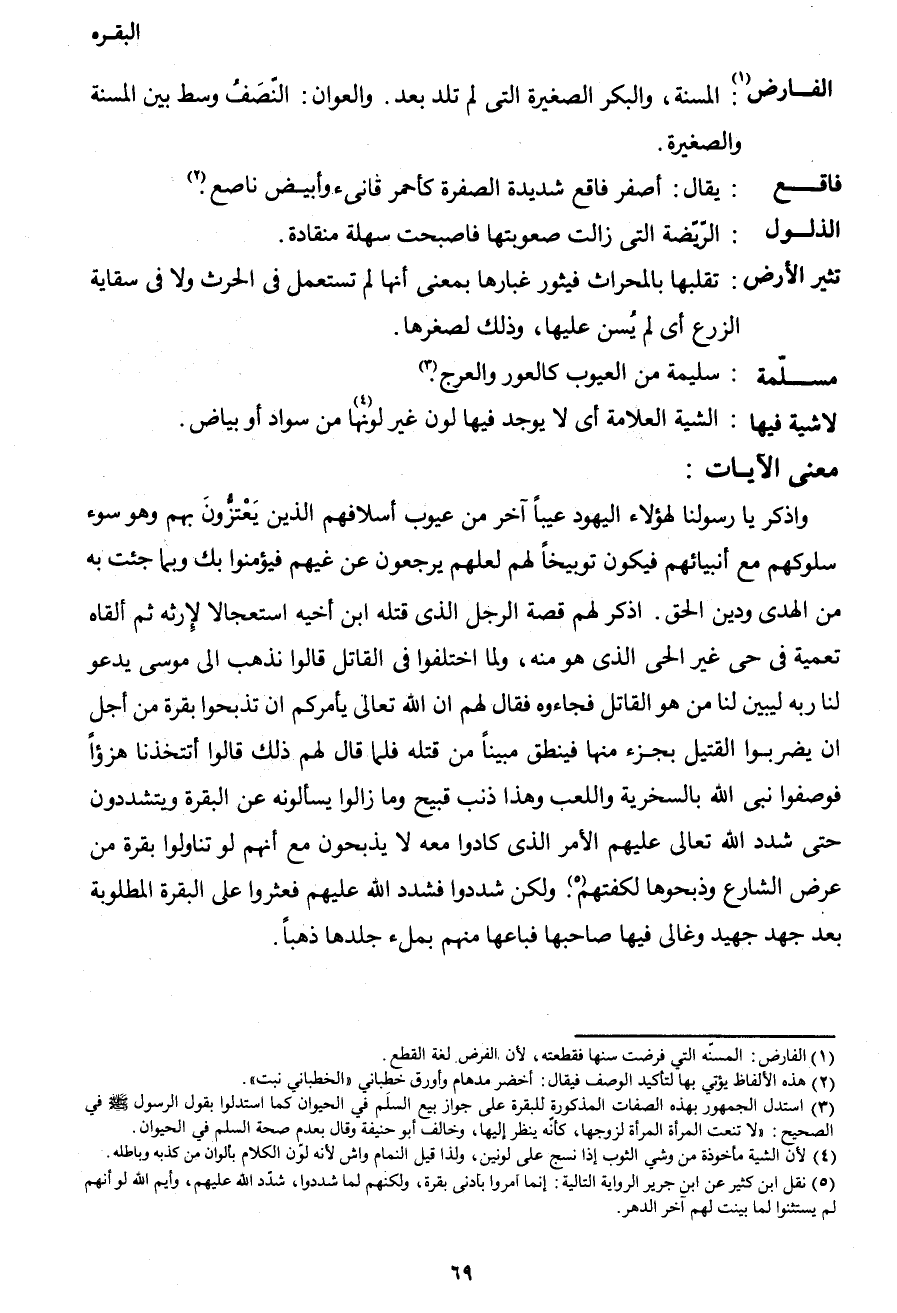 5 نقل ابن كثير عن ابن جرير الرواية التالية: إنما أمروا بأدنى بقرة، ولكنهم لما شددوا، شدد الله عليهم، وأيم الله لو أنهم لم يتثنوا لما بينت لهم آخر الدهر.