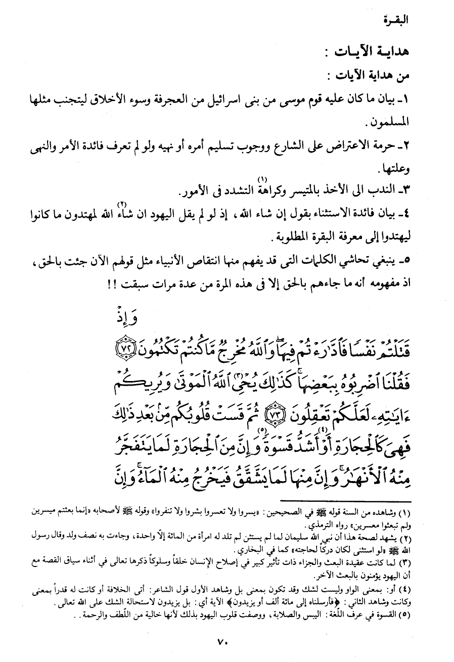 {وَإِذْ قَتَلْتُمْ نَفْساً فَادَّارَأْتُمْ فِيهَا وَاللهُ مُخْرِجٌ مَا كُنْتُمْ تَكْتُمُونَ (72) فَقُلْنَا اضْرِبُوهُ بِبَعْضِهَا كَذَلِكَ يُحْيِي3 اللهُ الْمَوْتَى وَيُرِيكُمْ آيَاتِهِ لَعَلَّكُمْ تَعْقِلُونَ (73) ثُمَّ قَسَتْ قُلُوبُكُمْ مِنْ بَعْدِ ذَلِكَ فَهِيَ كَالْحِجَارَةِ أَوْ4 أَشَدُّ قَسْوَةً5 وَإِنَّ مِنَ الْحِجَارَةِ لَمَا يَتَفَجَّرُ مِنْهُ الأَنْهَارُ وَإِنَّ مِنْهَا لَمَا يَشَّقَّقُ فَيَخْرُجُ مِنْهُ الْمَاءُ وَإِنّ