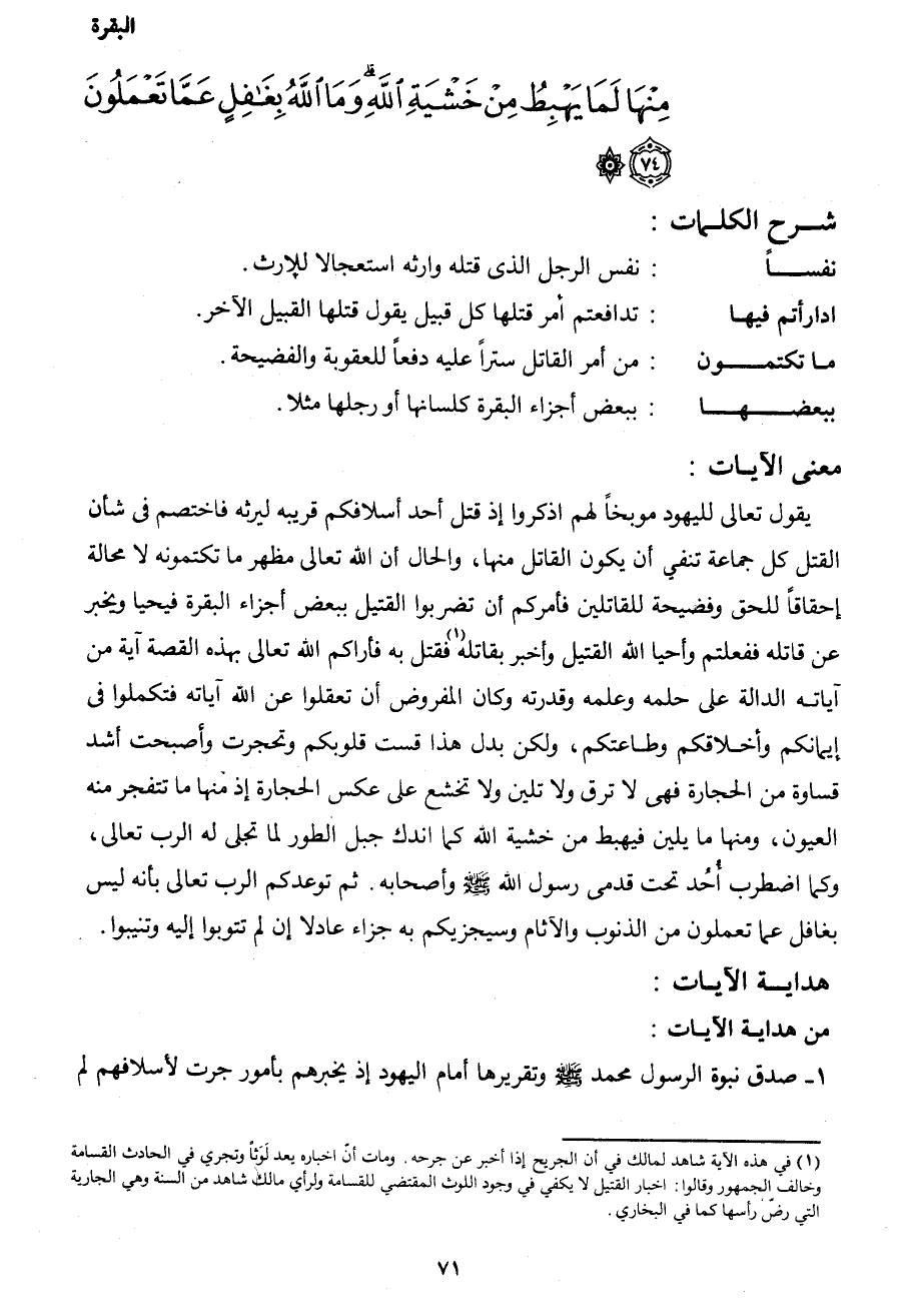 يقول تعالى لليهود موبخاً لهم اذكروا إذ قتل أحد أسلافكم قريبه ليرثه، فاختصم في شأن القتل كل جماعة تنفي أن يكون القاتل منها، والحال أن الله تعالى مظهر ما تكتمونه لا محالة إحقاقاً للحق وفضيحة للقاتلين، فأمركم أن تضربوا القتيل ببعض أجزاء البقرة، فيحيا ويخبر عن قاتله ففعلتم وأحيا الله القتيل وأخبر بقاتله1 فقتل به، فأراكم الله تعالى بهذه القصة آية من آياته الدالة على حلمه وعلمه وقدرته، وكان المفروض أن تعقلوا عن الله آياته فتكملوا في إيمانكم وأخلاقكم وطاعتكم، ولكن بدل هذا قست قلوبكم وتحجرت وأصبحت أشد قساوة من الحجارة فهي لا ترق ولا تلين ولا تخشع على عكس الحجارة، إذ منها ما تتفجر منه العيون، ومنها ما يلين فيهبط من خشية الله؛ كما اندك جبل الطور لما تجلى له الرب تعالى، وكما أضطرب أحد تحت قدمي رسول الله صَلَّى اللهُ عَلَيْهِ وَسَلَّمَ وأصحابه. ثم توعدكم الرب تعالى بأنه ليس بغافل عما تعملون من الذنوب والآثام، وسيجزيكم به جزاء عادلاً إن لم تتوبوا إليه وتنيبوا.