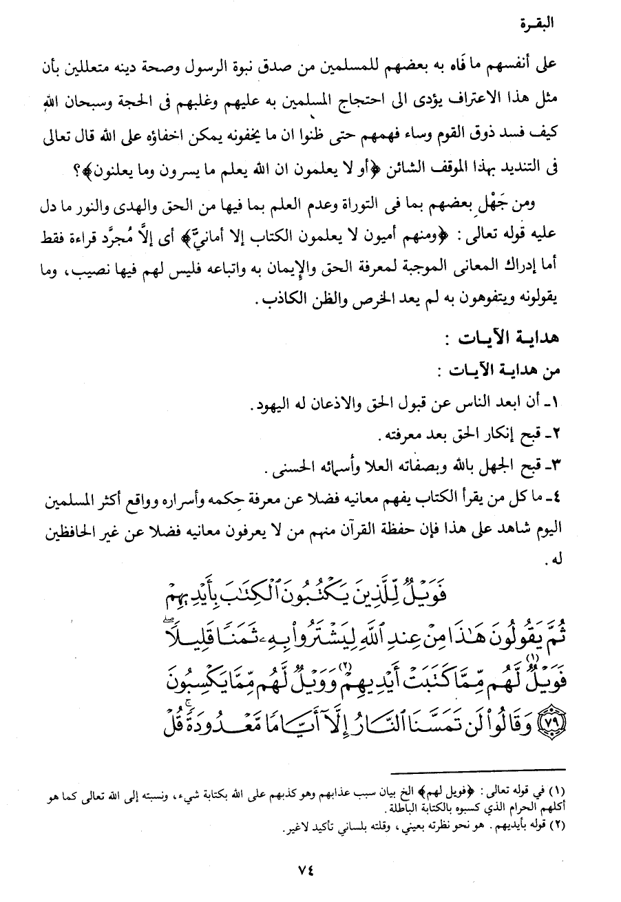 {فَوَيْلٌ1 لِلَّذِينَ يَكْتُبُونَ الْكِتَابَ بِأَيْدِيهِمْ2 ثُمَّ يَقُولُونَ هَذَا مِنْ عِنْدِ اللهِ لِيَشْتَرُوا بِهِ ثَمَناً قَلِيلاً فَوَيْلٌ لَهُمْ مِمَّا كَتَبَتْ أَيْدِيهِمْ وَوَيْلٌ لَهُمْ مِمَّا يَكْسِبُونَ (79) وَقَالُوا لَنْ تَمَسَّنَا النَّارُ إِلا أَيَّاماً مَعْدُودَةً قُلْ