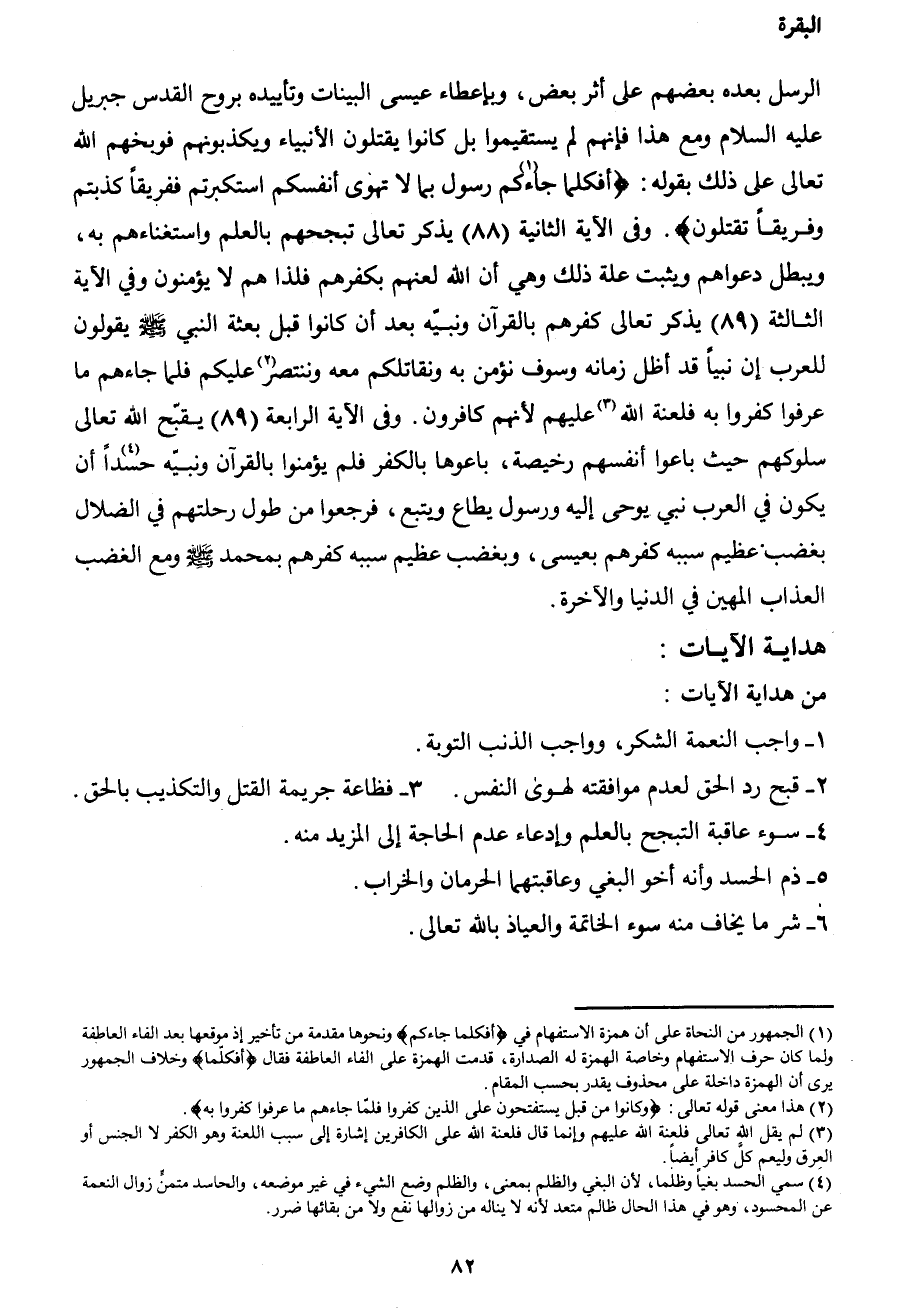 الرسل بعده بعضهم على أثر بعض، وبإعطاء عيسى البينات وتأييده بروح القدس جبريل عليه السلام ومع هذا فإنهم لم يستقيموا بل كانوا يقتلون الأنبياء ويكذبونهم، فوبخهم الله تعالى على ذلك بقوله: {أَفَكُلَّمَا جَاءَكُمْ1 رَسُولٌ بِمَا لا تَهْوَى أَنْفُسُكُمُ اسْتَكْبَرْتُمْ فَفَرِيقاً كَذَّبْتُمْ وَفَرِيقاً تَقْتُلُونَ} . وفي الآية الثانية (88) يذكر تعالى تبجحهم بالعلم واستغناءهم به، ويبطل دعواهم وثبت علة ذلك وهي: أن الله لعنهم بكفرهم، فلذا هم لا يؤمنون، وفي الآية الثالثة (89) يذكر تعالى كفرهم بالقرآن ونبيه بعد أن كانوا قبل بعثة النبي صَلَّى اللهُ عَلَيْهِ وَسَلَّمَ يقولون للعرب إن نبياً قد أظل زمانه وسوف نؤمن به ونقاتلكم معه وننتصر2 عليكم، فما جاءهم ما عرفوا كفروا به فلعنة الله3 عليهم؛ لأنهم كافرون. وفي الآية الرابعة (89) يقبح الله تعالى سلوكهم حيث باعوا أنفسهم رخيصة، باعوها بالكفر فلم يؤمنوا بالقرآن ونبيه حسدا4 أن يكون في العرب نبي يوحى إليه، ورسول يطاع ويتبع، فرجعوا من طول رحلتهم في الضلال بغضب عظيم سببه كفرهم بعيسى، وبغضب عظيم سببه كفرهم بمحمد صَلَّى اللهُ عَلَيْهِ وَسَلَّمَ ومع الغضب العذاب المهين في الدنيا والآخرة.