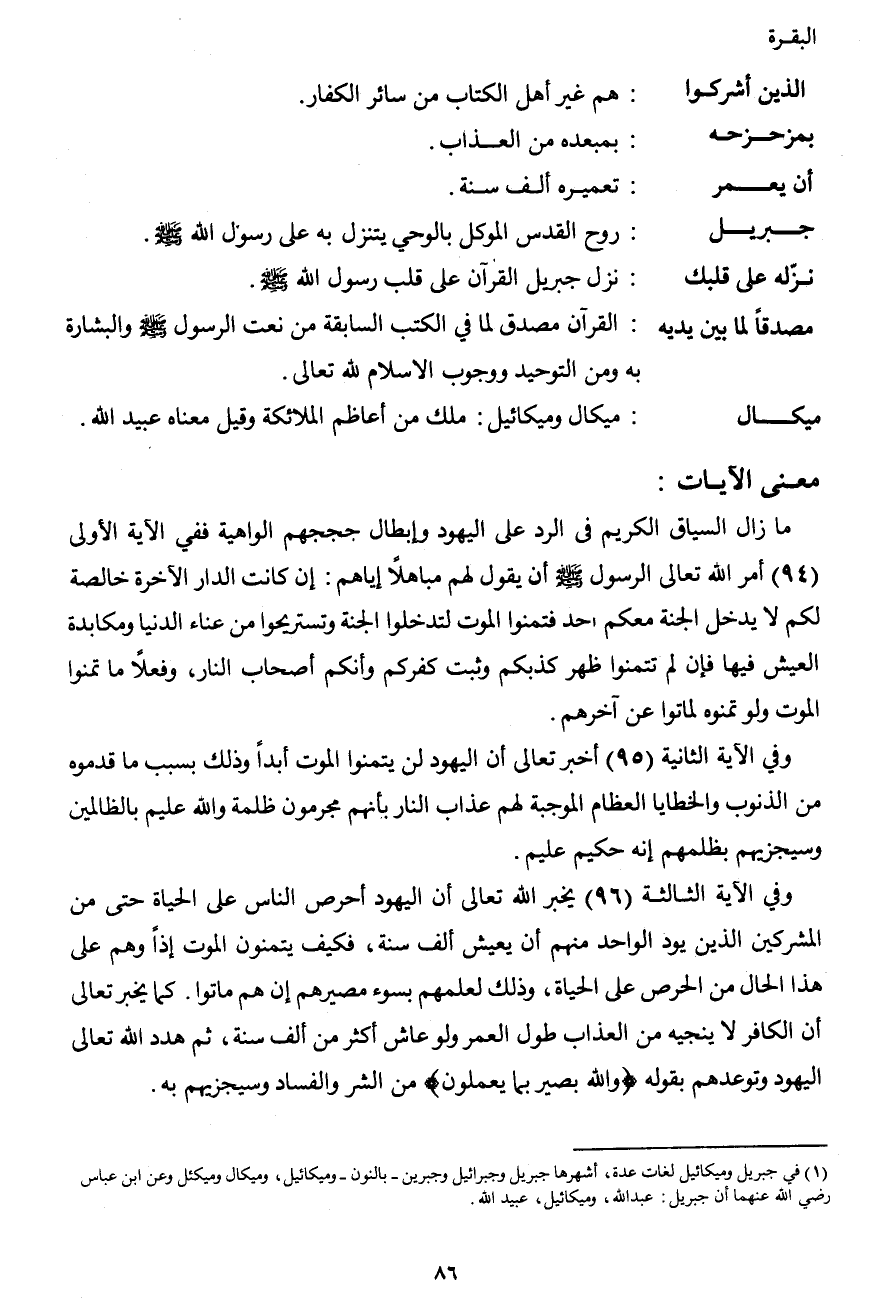 1 في جبريل وميكائيل لغات عدة، أشهرها: جبريل وجبرائيل وجبرين –بالنون- وميكائيل، وميكال، ميكائيل. وعن ابن عباس رضي الله عنهما: عبد الله، وميكائيل، عبيد الله.