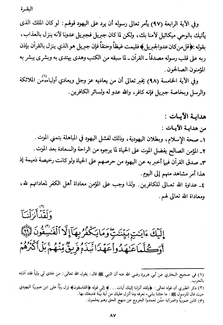 وفي الآية الخامسة (98) يخبر تعالى أن من يعاديه عز وجل ويعادي أولياءه1 من الملائكة والرسل وبخاصة جبريل فإنه كافر، والله عدو له ولسائر الكافرين.