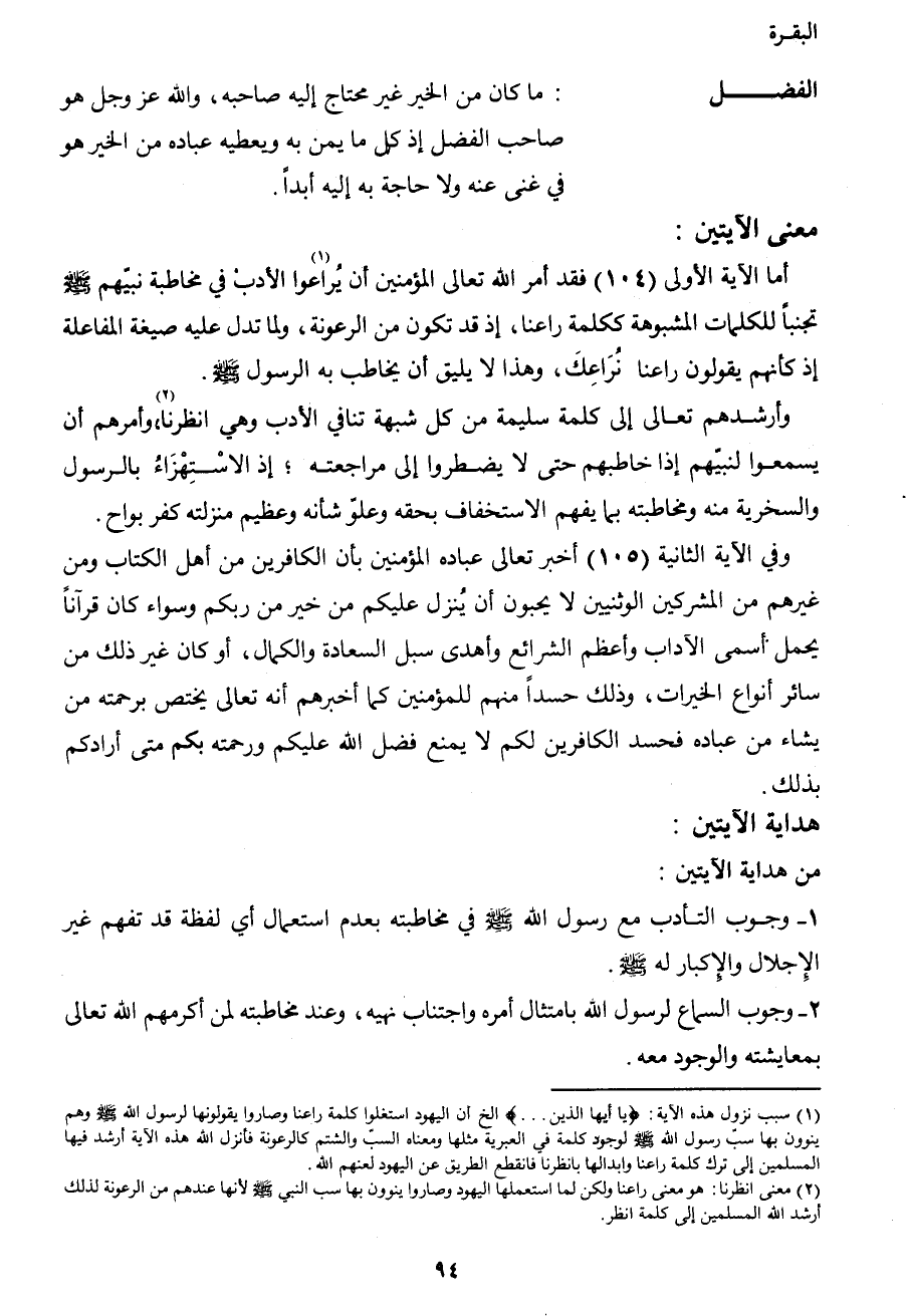 أما الآية الأولى (104) فقد أمر الله تعالى المؤمنين أن يراعوا1 الأدب في مخاطبة نبيهم صَلَّى اللهُ عَلَيْهِ وَسَلَّمَ تجنباً للكلمات المشبوهة؛ ككلمة: راعنا، إذ قد تكون من الرعونة، ولما تدل عليه صيغة المفاعلة؛ إذ كأنهم يقولون: راعنا نُراعك، وهذا لا يليق أن يخاطب به الرسول صَلَّى اللهُ عَلَيْهِ وَسَلَّمَ.