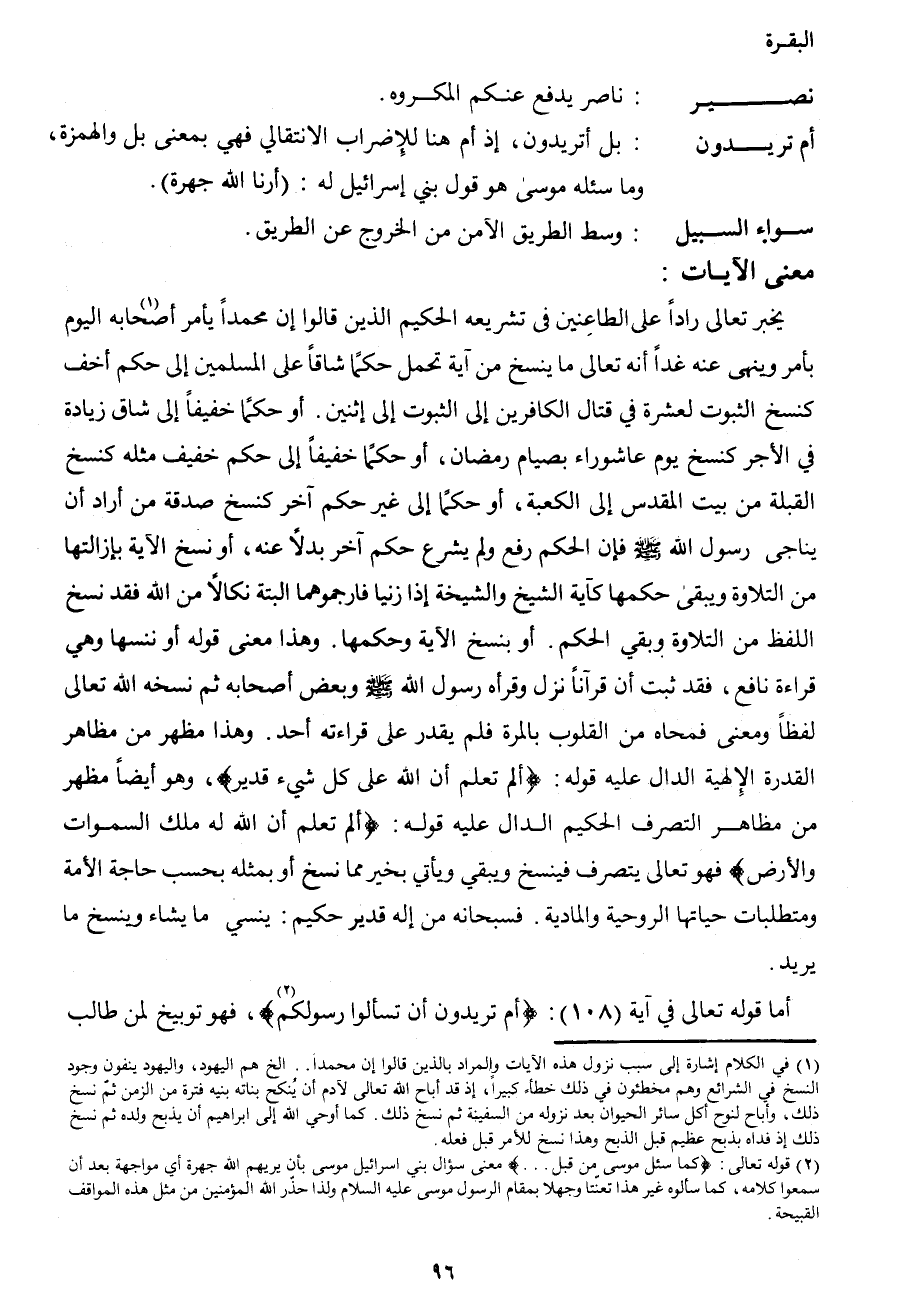 يخبر تعالى راداً على الطاعنين في تشريعه الحكيم الذين قالوا: إن محمداً يأمر أصحابه1 اليوم بأمر وينهى عنه غداً، أنه تعالى ما ينسخ من آية تحمل حكماً شاقاً على المسلمين إلى حكم أخف؛ كنسخ الثبوت لعشرة في قتال الكافرين إلى الثبوت إلى اثنين. أو حكماً خفيفاً إلى شاق زيادة في الأجر؛ كنسخ يوم عاشوراء بصيام رمضان، أو حكماً خفيفاً إلى حكم خفيف مثله؛ كنسخ القبلة من بيت المقدس إلى الكعبة، أو حكماً غير حكم آخر؛ كنسخ صدقة من أراد أن يناجي رسول الله صَلَّى اللهُ عَلَيْهِ وَسَلَّمَ، فإن الحكم رفع ولم يشرع حكم آخر بدلاً عنه، أو نسخ الآية بإزالتها من التلاوة، ويبقى حكمها؛ كآية الشيخ والشيخة إذا زنيا فارجموهما البتة نكالاً من الله، فقد نسخ اللفظ من التلاوة وبقي الحكم. أو ينسخ الآية وحكمها. وهذا معنى قوله: {أَوْ نُنْسِهَا} ، وهي قراءة نافع، فقد ثبت أن قرآناً نزل وقرأه رسول الله صَلَّى اللهُ عَلَيْهِ وَسَلَّمَ وبعض أصحابه ثم نسخه الله تعالى لفظاً، ومعنى فمحاه من القلوب بالمرة فلم يقدر على قراءته أحد. وهذا مظهر من مظاهر القدرة الإلهية الدال عليه قوله: {أَلَمْ تَعْلَمْ أَنَّ اللهَ عَلَى كُلِّ شَيْءٍ قَدِيرٌ} ، وهو أيضاً مظهر من مظاهر التصرف الحكيم الدال عليه قوله: {أَلَمْ تَعْلَمْ أَنَّ اللهَ لَهُ مُلْكُ السَّمَاوَاتِ وَالأَرْضِ} فهو تعال يتصرف فينسخ ويبقي ويأتي بخير مما نسخ أو بمثله بحسب حاجة الأمة ومتطلبات حياتها الروحية والمادية. فسبحانه من إله قدير حكيم: ينسي ما يشاء وينسخ ما يريد.