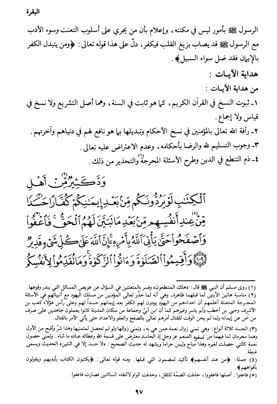 {وَدَّ كَثِيرٌ2 مِنْ أَهْلِ الْكِتَابِ لَوْ يَرُدُّونَكُمْ مِنْ بَعْدِ إِيمَانِكُمْ كُفَّاراً حَسَداً3 مِنْ4 عِنْدِ أَنْفُسِهِمْ مِنْ بَعْدِ مَا تَبَيَّنَ لَهُمُ الْحَقُّ فَاعْفُوا5 وَاصْفَحُوا حَتَّى يَأْتِيَ اللهُ بِأَمْرِهِ إِنَّ اللهَ عَلَى كُلِّ شَيْءٍ قَدِيرٌ (109) وَأَقِيمُوا الصَّلاةَ وَآتُوا الزَّكَاةَ وَمَا تُقَدِّمُوا لأَنْفُسِكُمْ