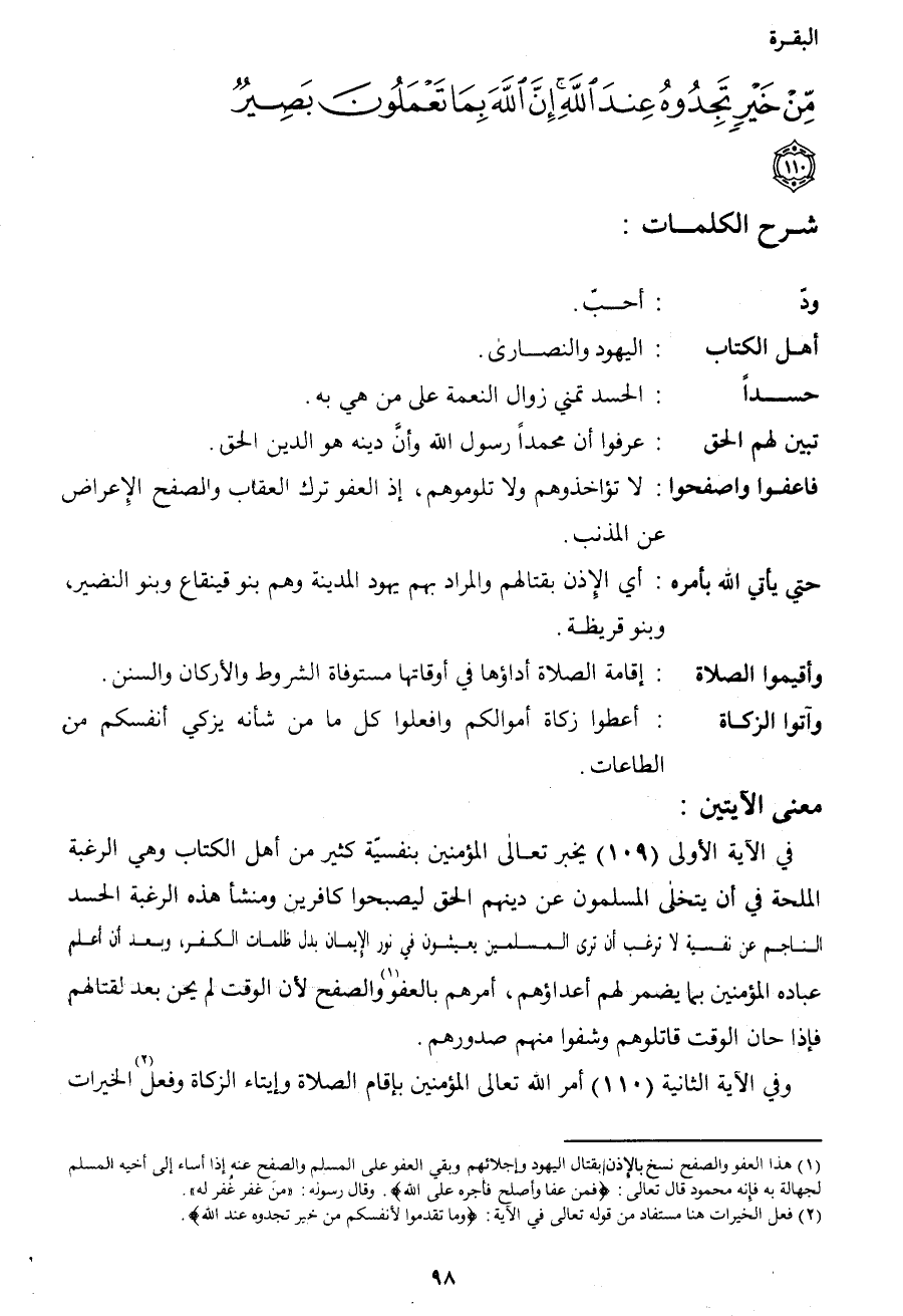 في الآية الأولى (109) يخبر تعالى المؤمنين بنفسية كثير من أهل الكتاب وهي الرغبة الملحة في أن يتخلى المسلمون عن دينهم الحق ليصبحوا كافرين، ومنشأ هذه الرغبة الحسد الناجم عن نفسية لا ترغب أن ترى المسلمين يعيشون في نور الإيمان بدل ظلمات الكفر، وبعد أن أعلم عباده المؤمنين بما يضمر لهم أعداؤهم، أمرهم بالعفو1 والصفح؛ لأن الوقت لم يحن بعد لقتالهم فإذا حان الوقت قاتلوهم وشفوا منهم صدورهم.