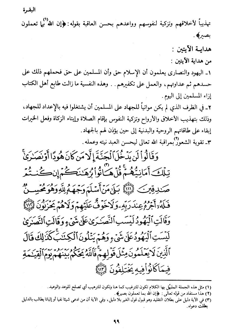 {وَقَالُوا لَنْ يَدْخُلَ الْجَنَّةَ إِلا مَنْ كَانَ هُوداً أَوْ نَصَارَى تِلْكَ أَمَانِيُّهُمْ قُلْ هَاتُوا3 بُرْهَانَكُمْ إِنْ كُنْتُمْ صَادِقِين (111) بَلَى مَنْ أَسْلَمَ وَجْهَهُ لِلَّهِ وَهُوَ مُحْسِنٌ فَلَهُ أَجْرُهُ عِنْدَ رَبِّهِ وَلا خَوْفٌ عَلَيْهِمْ وَلا هُمْ يَحْزَنُونَ (112) وَقَالَتِ الْيَهُودُ لَيْسَتِ النَّصَارَى عَلَى شَيْءٍ وَقَالَتِ النَّصَارَى لَيْسَتِ الْيَهُودُ عَلَى شَيْءٍ وَهُمْ يَتْلُونَ الْكِتَابَ كَذَلِكَ قَالَ الَّذِينَ لا يَعْلَمُونَ مِثْلَ قَوْلِهِمْ فَاللهُ يَحْكُمُ بَيْنَهُمْ يَوْمَ الْقِيَامَةِ فِيمَا كَانُوا فِيهِ يَخْتَلِفُون (113) }