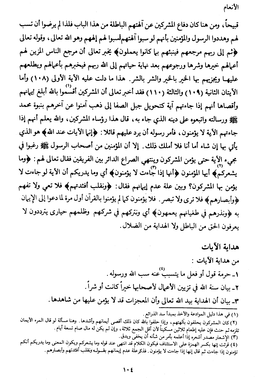 قبيحاً، ومن هنا كان دفاع المشركين عن آلهتهم الباطلة من هذا الباب فلذا لم يرضوا أن تسب لهم وهددوا الرسول والمؤمنين بأنهم لو سبوا آلهتهم لسبوا لهم آلهتهم وهو الله تعالى، وقوله تعالى {ثم إلى ربهم مرجعهم فينبئهم بما كانوا يعملون} يخبر تعالى أن مرجع الناس المزين لهم أعمالهم خيرها وشرها ورجوعهم بعد نهاية حياتهم إلى الله ربهم فيخبرهم بأعمالهم ويطلعهم عليها ويجزيهم بها الخير بالخير والشر بالشر. هذا ما دلت عليه الآية الأولى (108) وأما الآيتان الثانية (109) والثالثة (110) فقد أخبر تعالى أن المشركين أقسموا1 بالله أبلغ إيمانهم وأقصاها أنهم إذا جاءتهم آية كتحويل جبل الصفا إلى ذهب آمنوا عن آخرهم بنبوة محمد صَلَّى اللهُ عَلَيْهِ وَسَلَّمَ ورسالته واتبعوه على دينه الذي جاء به، قال هذا رؤساء المشركين، والله يعلم أنهم إذا جاءتهم الآية لا يؤمنون، فأمر رسوله أن يرد عليهم قائلاً: {إنما الآيات عند الله} هو الذي يأتي بها إن شاء أما أنا فلا أملك ذلك. إلا أن المؤمنين من أصحاب الرسول صَلَّى اللهُ عَلَيْهِ وَسَلَّمَ رغبوا في مجيء الآية حتى يؤمن المشركون وينتهي الصراع الدائر بين الفريقين فقال تعالى لهم: {وما يشعركم2} أيها المؤمنون {أنها إذا جاءت3 لا يؤمنون} أي وما يدريكم أن الآية لو جاءت لا يؤمن بها المشركون؟ وبين علة عدم إيمانهم فقال: {ونقلب أفئدتهم} فلا تعي ولا تفهم {وأبصارهم} فلا ترى ولا تبصر. فلا يؤمنون كما لم يؤمنوا بالقرآن أول مرة لما دعوا إلى الإيمان به {ونذرهم في طغيانهم يعمهون} أي ونتركهم في شركهم وظلمهم حيارى يترددون لا يعرفون الحق من الباطل ولا الهداية من الضلال.