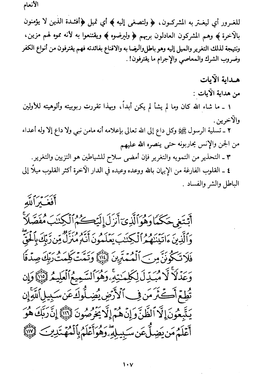 أَفَغَيْرَ اللهِ أَبْتَغِي حَكَمًا وَهُوَ الَّذِي أَنَزَلَ إِلَيْكُمُ الْكِتَابَ مُفَصَّلاً وَالَّذِينَ آتَيْنَاهُمُ الْكِتَابَ يَعْلَمُونَ أَنَّهُ مُنَزَّلٌ مِّن رَّبِّكَ بِالْحَقِّ فَلاَ تَكُونَنَّ مِنَ الْمُمْتَرِينَ (114) وَتَمَّتْ كَلِمَتُ رَبِّكَ صِدْقًا وَعَدْلاً لاَّ مُبَدِّلِ لِكَلِمَاتِهِ وَهُوَ السَّمِيعُ الْعَلِيمُ (115) وَإِن تُطِعْ أَكْثَرَ مَن فِي الأَرْضِ يُضِلُّوكَ عَن سَبِيلِ اللهِ إِن يَتَّبِعُونَ إِلاَّ الظَّنَّ وَإِنْ هُمْ إِلاَّ يَخْرُصُونَ (116) إِنَّ رَبَّكَ هُوَ أَعْلَمُ مَن يَضِلُّ عَن سَبِيلِهِ وَهُوَ أَعْلَمُ بِالْمُهْتَدِينَ (117)